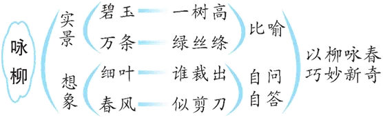 过渡:诗人是怎样咏柳的呢?我们一起走进诗歌。 1.学习“碧玉妆成一树高,万条垂下绿丝绦”。 (1)指导理解“碧玉”。 ①课件出示“碧玉”图片,引导观察碧玉的外形特点,尤其是颜色和光泽。②想想“碧玉”和柳树的哪部分相似。③明确:诗人用碧玉来形容柳树鲜嫩的新叶。 (2)指导理解“丝绦”。 ①课件出示“丝绦”图片,学生直观地看到“丝绦”就是衣裙上的长长的丝带。②想想“丝绦”和柳树有什么相似的地方。③明确:“绿丝绦”指的是垂下来的、长满叶子的柳条。 (3)指名学生说诗意,其他学生闭上眼睛想象画面,听完再补充。教师点拨,如“一树”指满树。 2.学习“不知细叶谁裁出,二月春风似剪刀”。 (1)教师提问:这么美的柳条,这么漂亮的叶子,是谁裁出来的呢? (2)学生齐读:二月春风似剪刀。 (3)教师读诗句,引导学生结合课本插图,想象春风裁剪柳叶的画面。 (4)一问一答合作读。 ①师生合作读:教师读前半句,学生读后半句。②分组合作读:一、三组读前半句,二、四组读后半句。③男女合作读:男生读前半句,女生读后半句。 (5)指名学生说诗意,师生评议。教师拓展:春风还可以裁出什么?学生自由回答。 3.熟读诗歌,感悟诗情。 (1)朗读古诗,正确流利。 ①自由读。②同桌互读、互听、互评。 (2)再读古诗,读出节奏。 ①教师配乐范读。明确节奏:碧玉/妆成/一树高,万条/垂下/绿丝绦。不知/细叶/谁裁出,二月/春风/似剪刀。②学生配乐读:指名读、分组读、男女生分开读、齐读。 | 1.观看“碧玉”和“丝绦”的图片,分组讨论柳树和这些事物的相似点,然后派代表发言,如“柳叶像碧玉一样绿”。 2.听老师朗读诗句,在脑海中想象柳树的样子,然后用自己的话描述想象的画面,如“我看到了高高的柳树,枝条像绿丝带一样飘动”。 3.参与合作朗读,先和老师一问一答读,再分小组比赛读,最后男女生交替读,体会诗歌的节奏和情感。 4.思考春风的威力,讨论春风除了裁剪柳叶,还能做什么(如吹开花朵、吹动湖水),并简单写下一两个想法。 | 引导学生抓住关键词“碧玉”和“丝绦”,想象画面,后又抓住“春风似剪刀”的特点,使学生感悟春天的勃勃生机。在反复吟诵的过程中,帮助学生理解诗人的情感。 | |