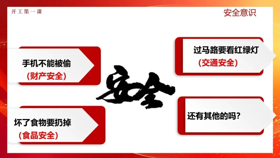 更多精品课件资料咨询可加小安:13522940595(收米)快乐春节!安全为本!一个欢乐、祥和、文明的春节,离不开安全的保障!提高安全意识可避免100%的事故!意识不到危险 才是最大的危险!如何把安全工作落到实处!上好开工第一课 把好安全第一关!