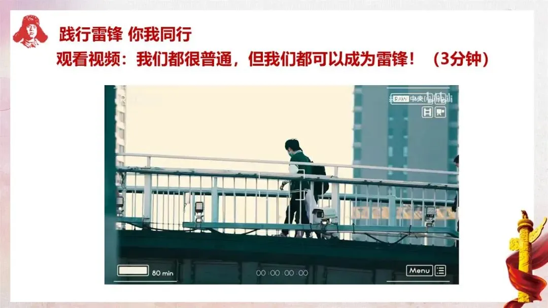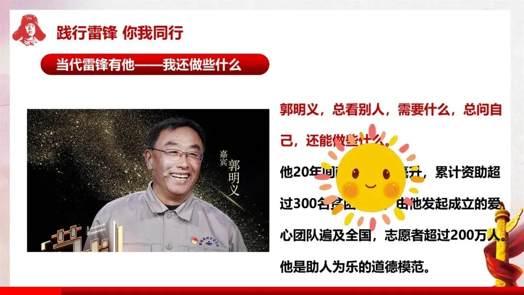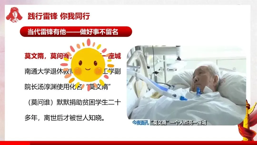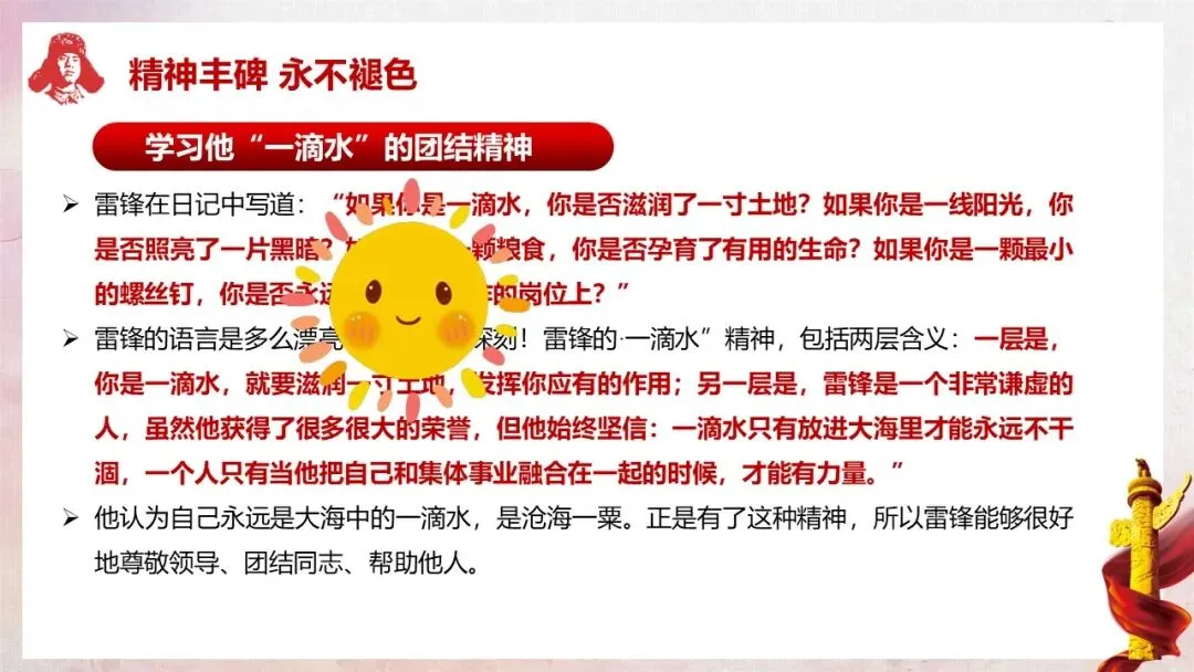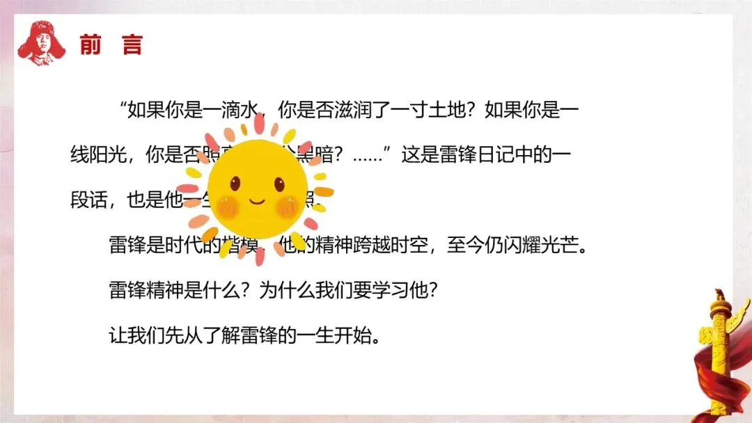 教师行为:板书班会主题“雷锋精神 永不褪色的丰碑”,随后深情朗诵雷锋日记中的经典语句:“如果你是一滴水,你是否滋润了一寸土地?如果你是一线阳光,你是否照亮了一分黑暗?……”,朗诵结束后展示课件中对应的前言内容。