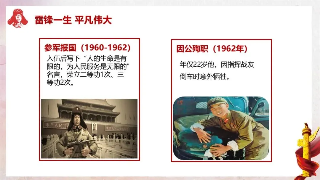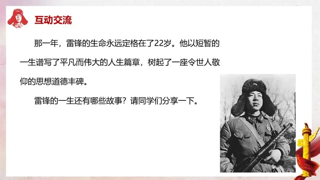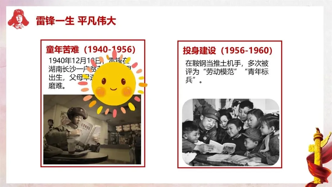 教师行为:按照课件内容,分四个阶段梳理雷锋的生平:1940-1956 年童年苦难,湖南长沙贫苦农民家庭出生,父母早逝;1956-1960 年投身建设,在鞍钢当推土机手,多次获评 “劳动模范”“青年标兵”;1960-1962 年参军报国,写下经典名言,荣立二等功 1 次、三等功 2 次;1962 年因公殉职,年仅 22 岁。结合课件中的时间线和文字资料,向学生详细讲述雷锋的人生经历。