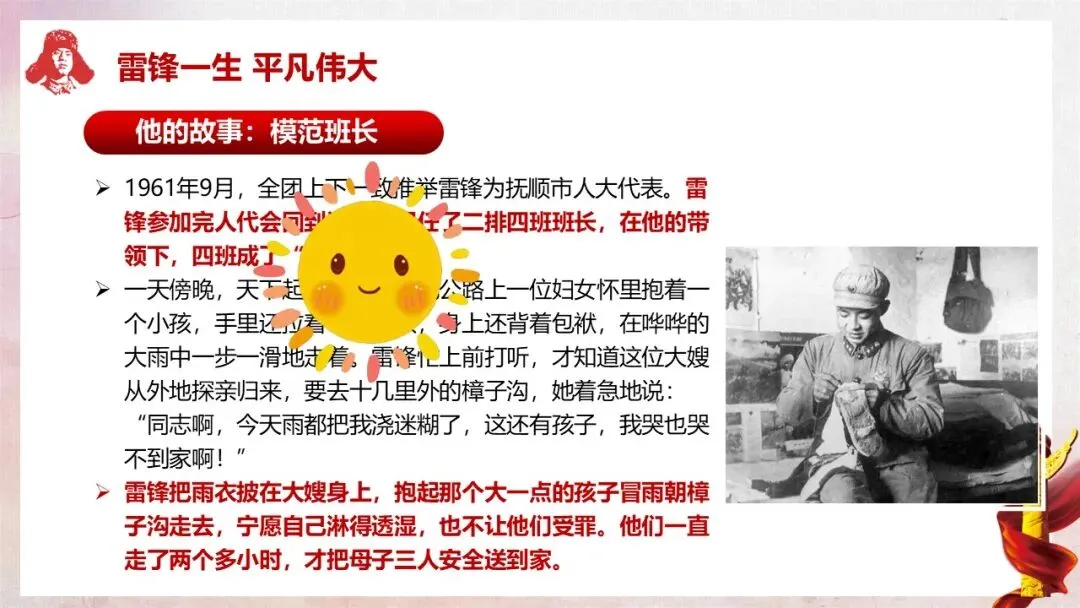过渡语:雷锋的一生只有短短22 年,没有惊天动地的壮举,却在平凡的生活中做了无数件好事。课件中为我们讲述了几个极具代表性的雷锋故事,接下来就让我们一起走进这些故事,感受雷锋的温暖与伟大。