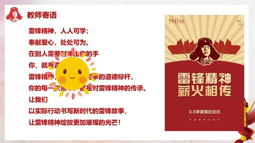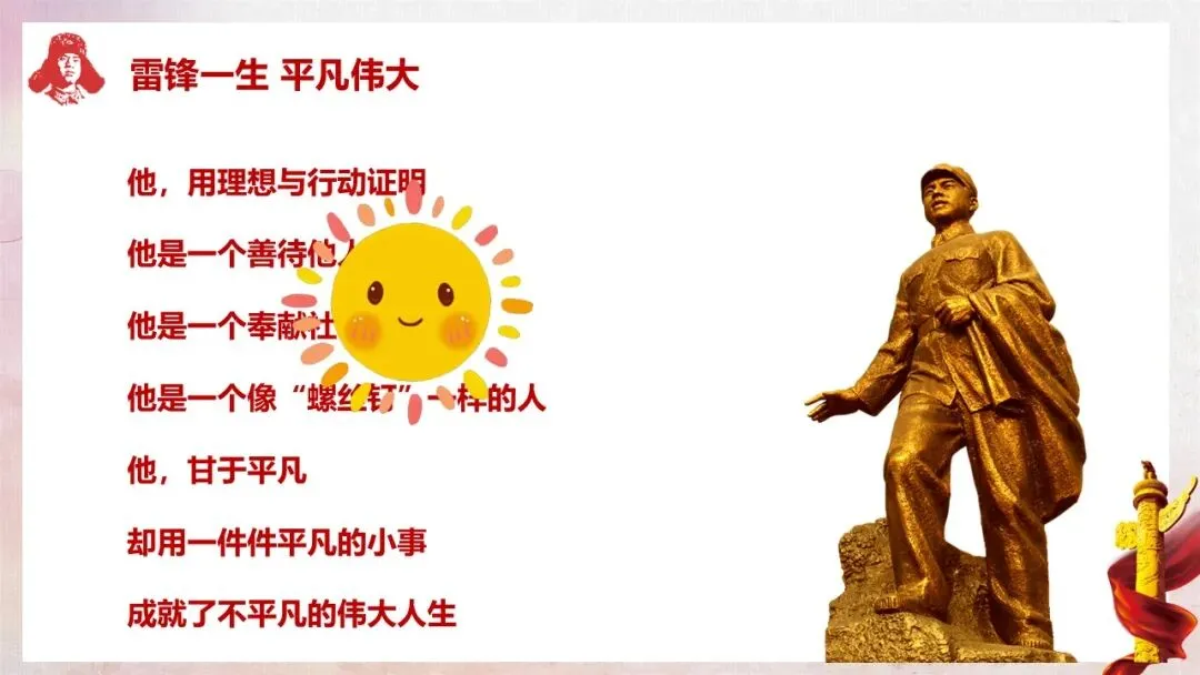 情感态度与价值观目标:激发学生对雷锋同志的崇敬之情,树立向雷锋学习的意识;引导学生以当代雷锋榜样为标杆,将雷锋精神融入日常学习生活,主动践行善举,积小善为大善,成为雷锋精神的传承者和弘扬者。