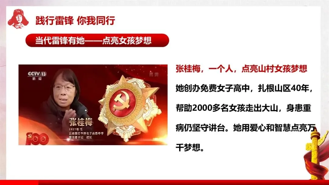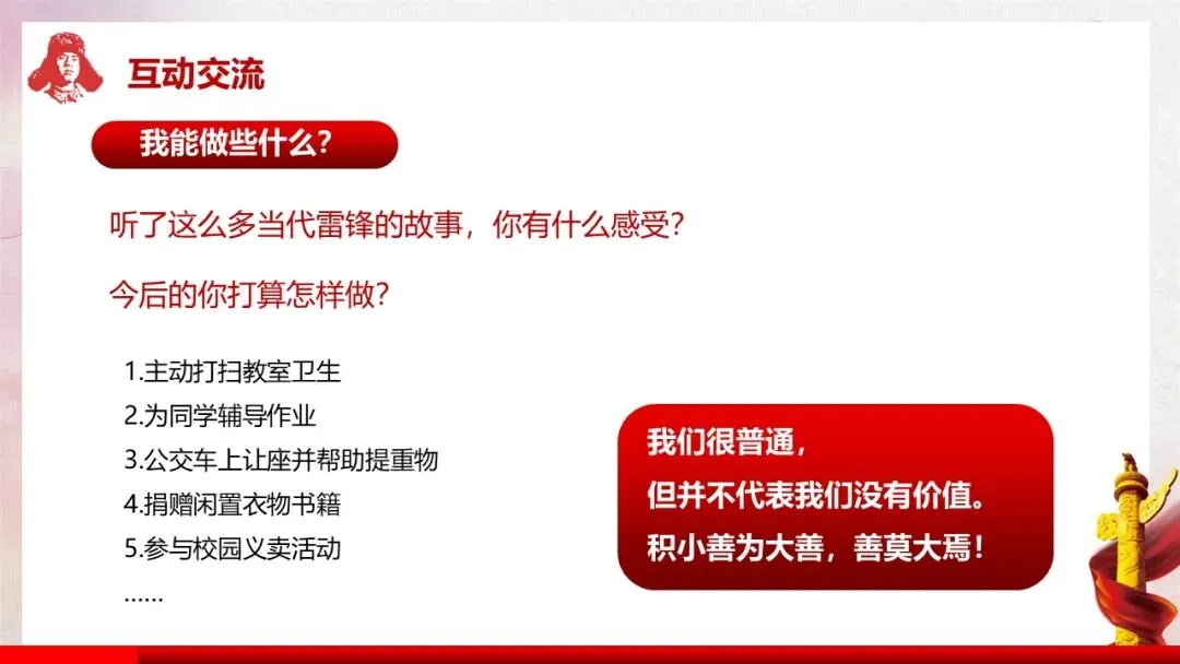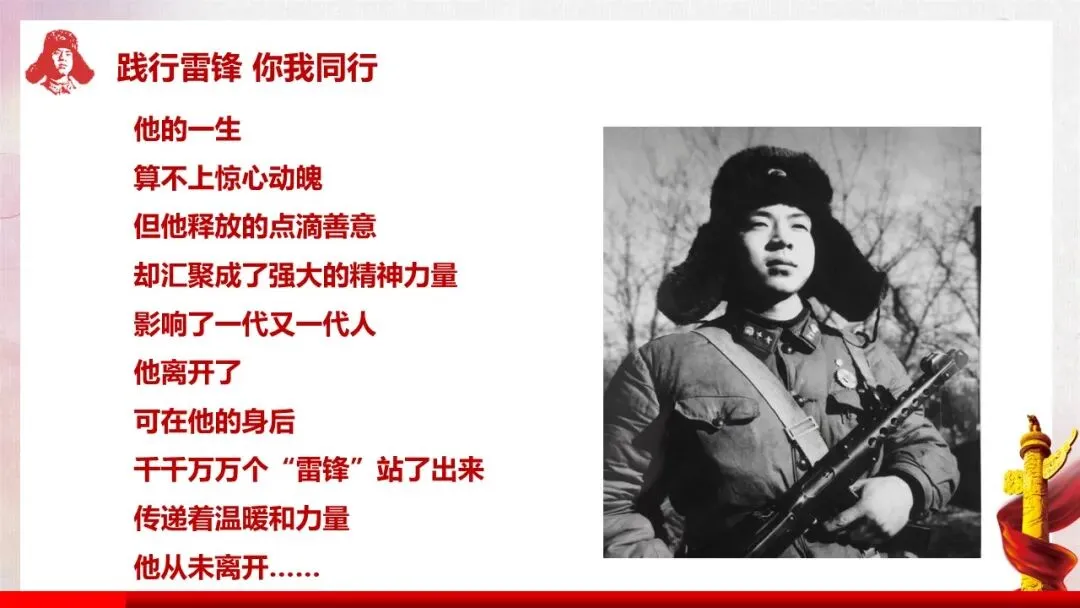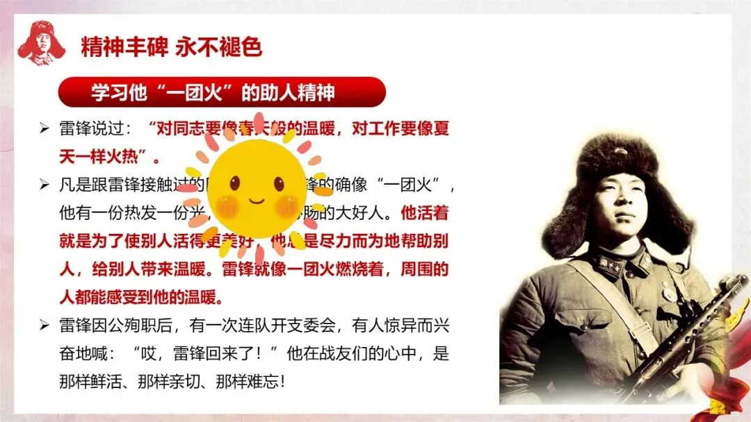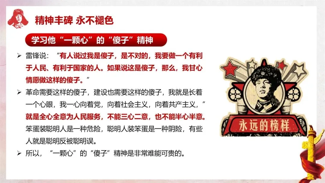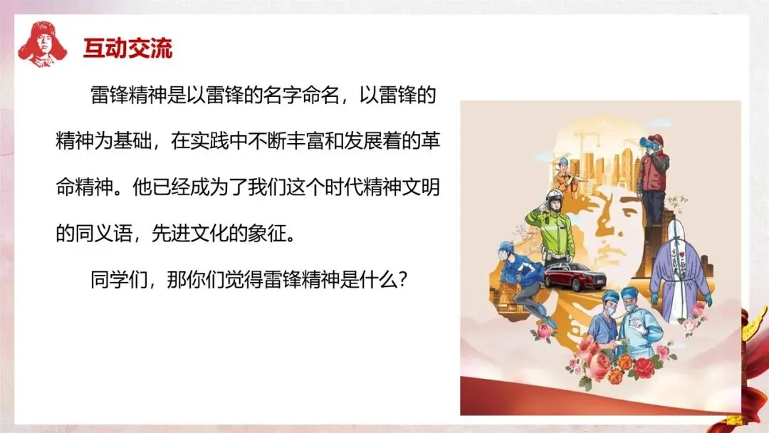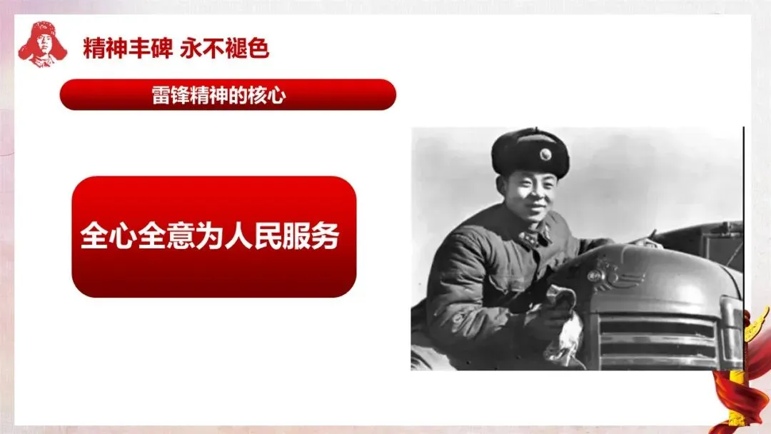 深入解读雷锋精神的核心内涵(全心全意为人民服务)及五大具体精神表现,让学生真正理解雷锋精神的时代价值。