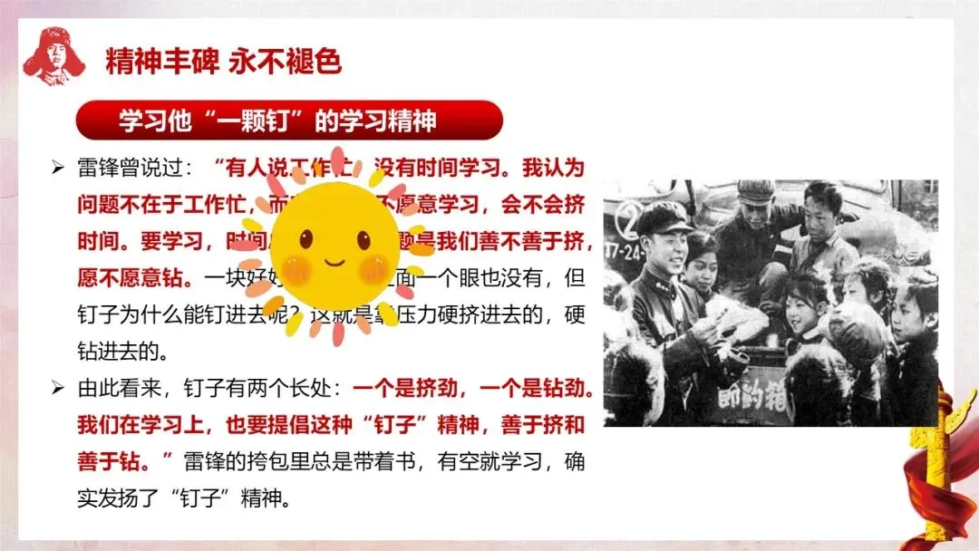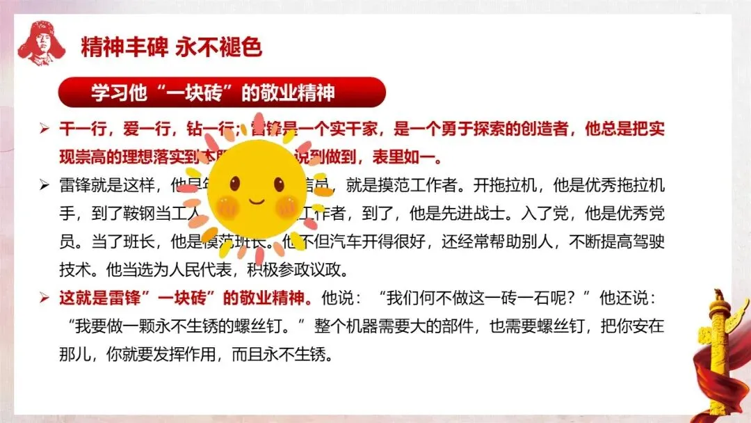 知识与技能目标:学生能够全面了解雷锋的生平经历,熟记雷锋的经典名言,清晰掌握雷锋精神的核心内涵及“一块砖” 敬业、“一颗心” 傻子、“一团火” 助人、“一颗钉” 学习、“一滴水” 团结等具体精神表现。