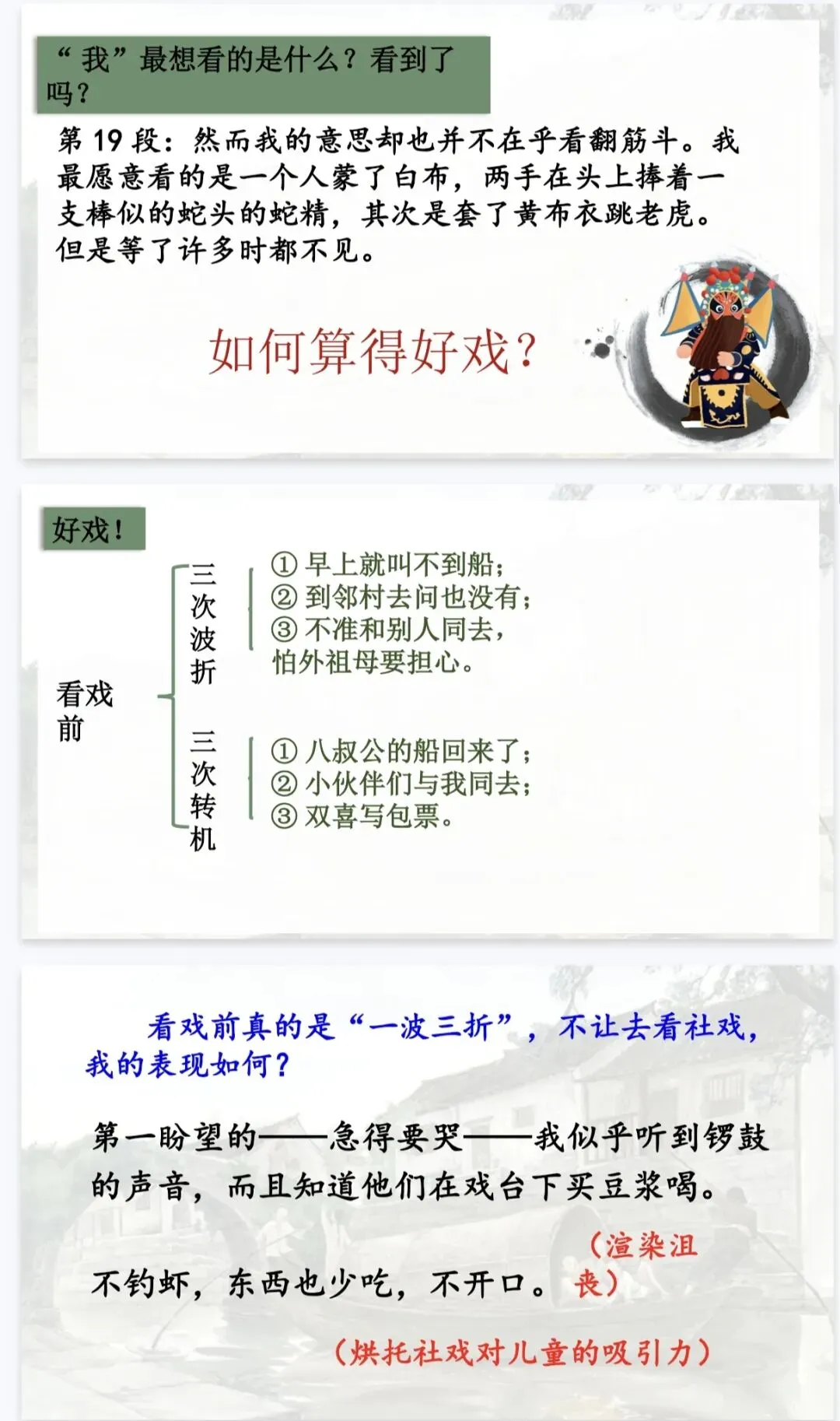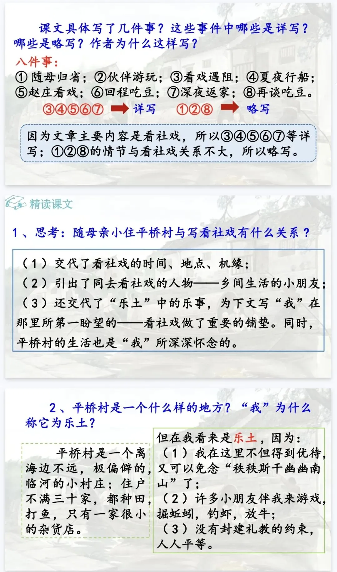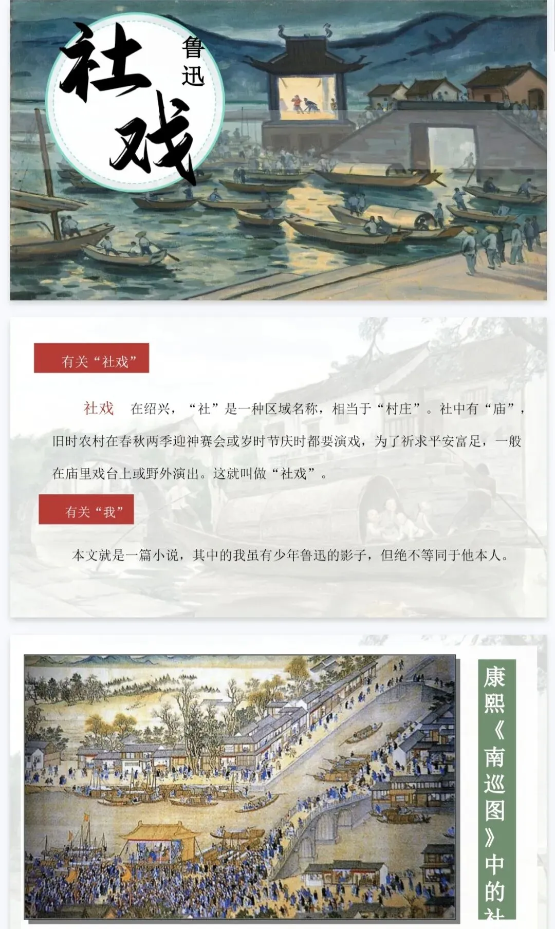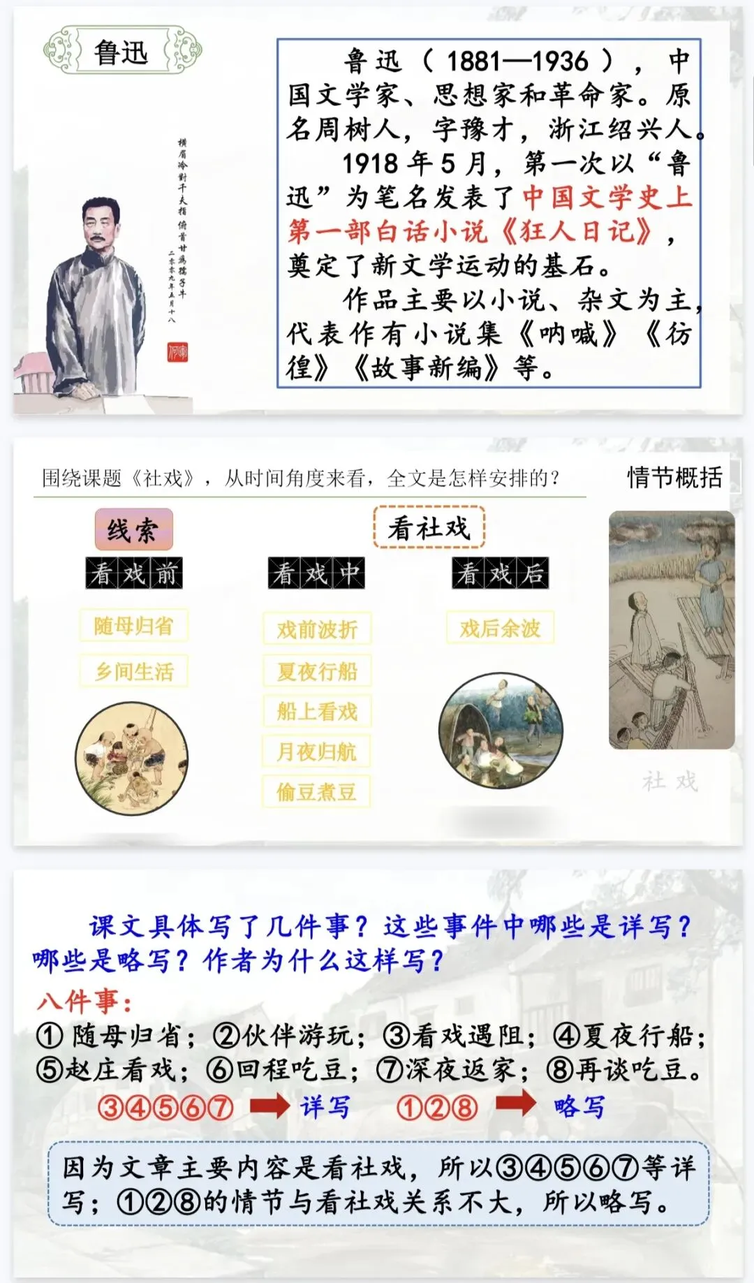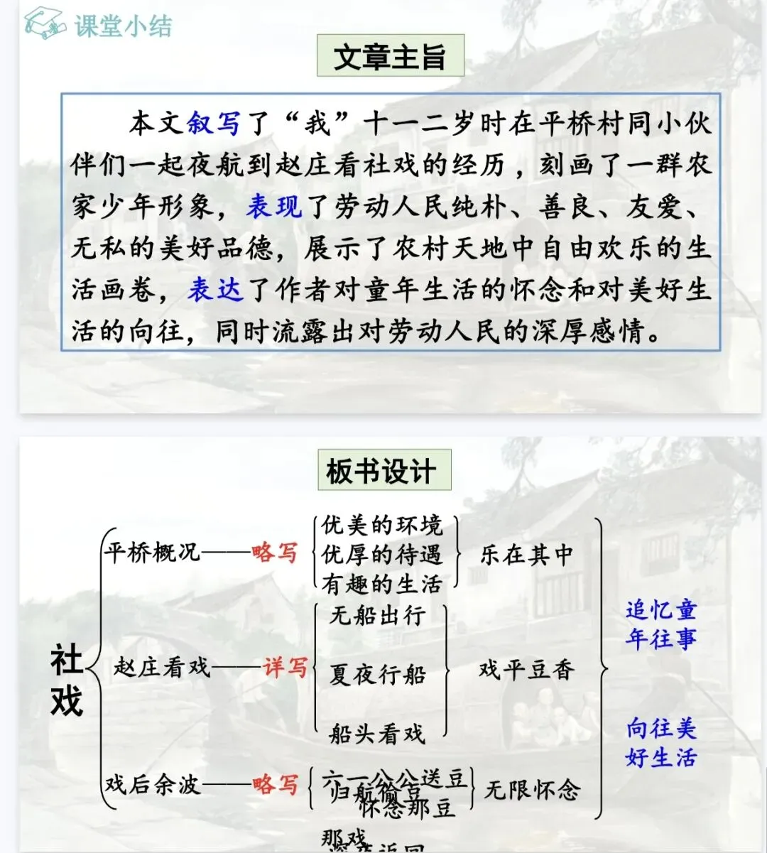 是那夜的事,是那夜藏在心底的温柔与深情。 这份《社戏》精品课件,正是为了帮你把这份“难忘”讲给学生听。它以“好豆好戏”为线索,从景、人、事三个维度层层深入,既有清晰的任务驱动框架,又有细腻的文本品读设计,让课堂既有温度又有深度。八年级语文老师备课,直接拿来就能用,帮你高效讲透鲁迅笔下的童年与乡愁!