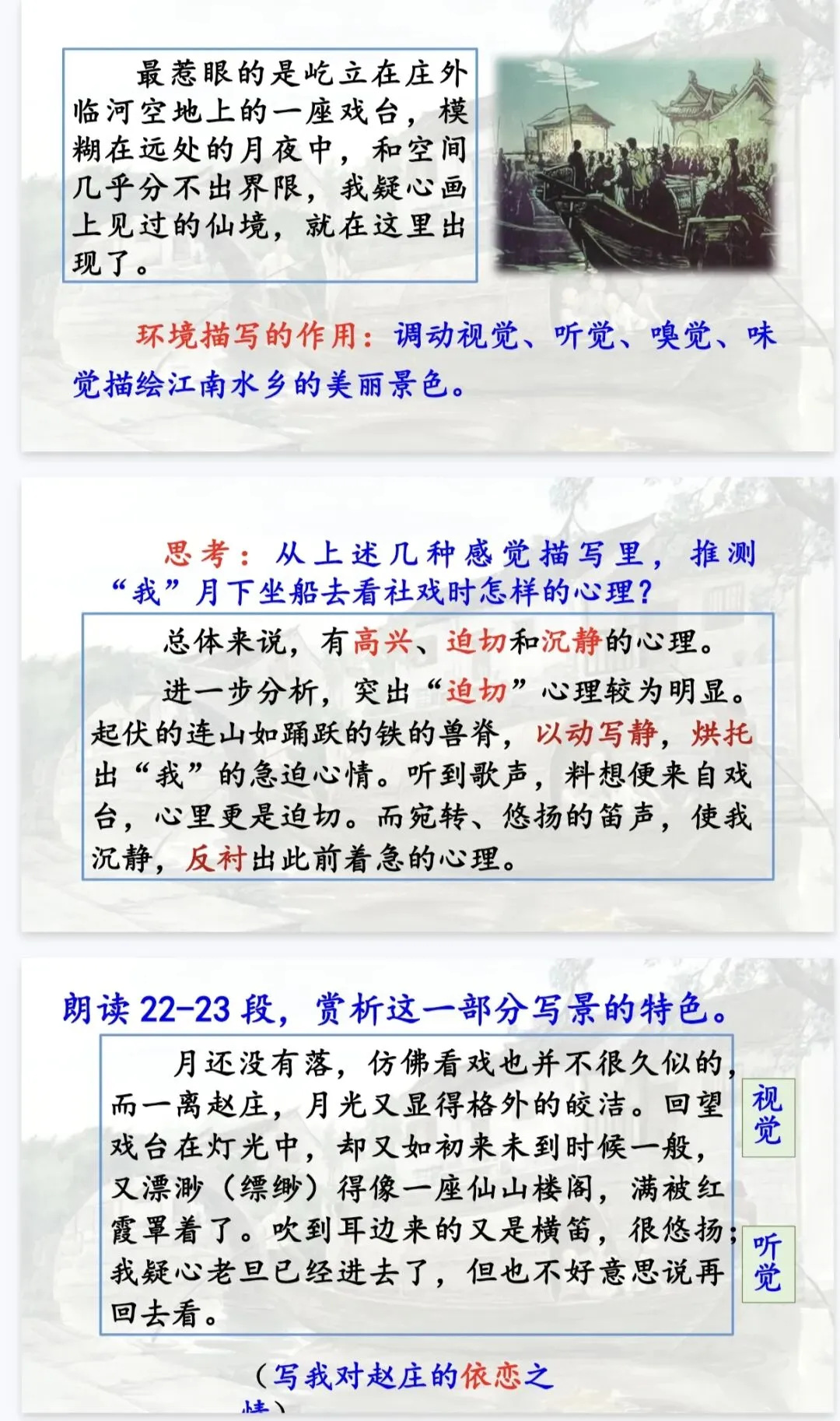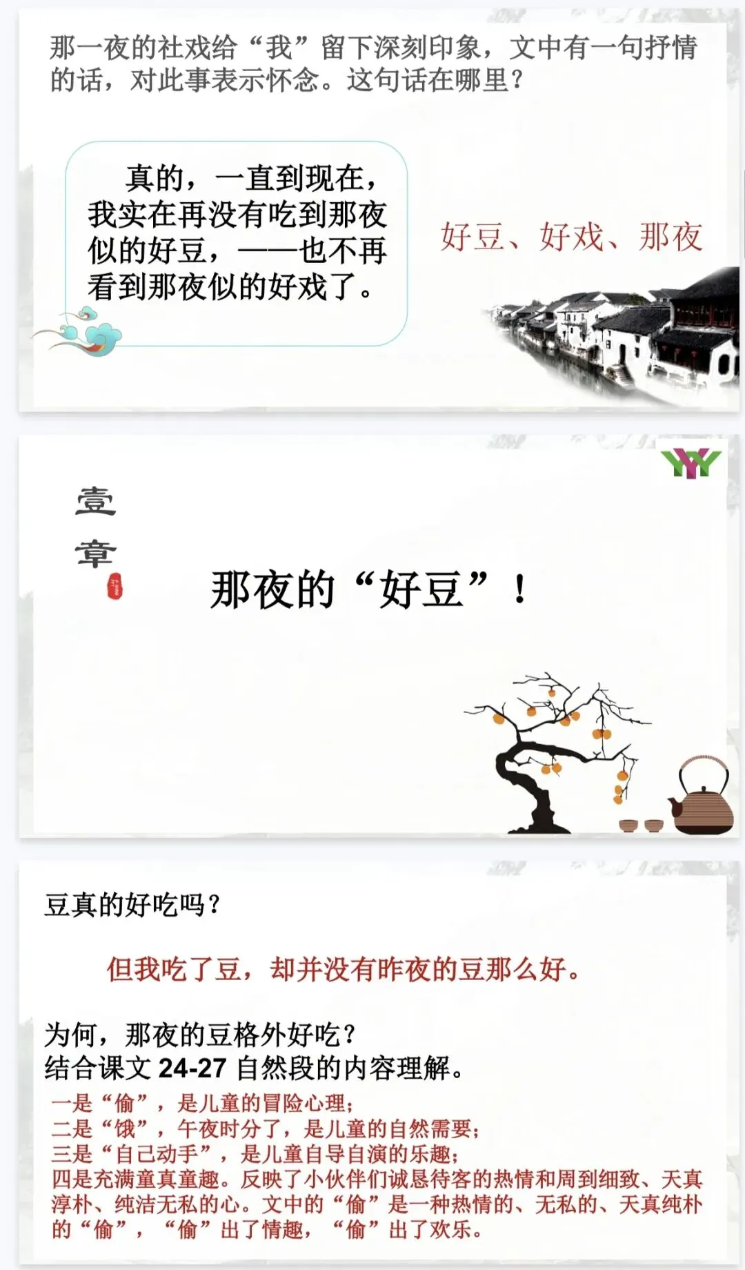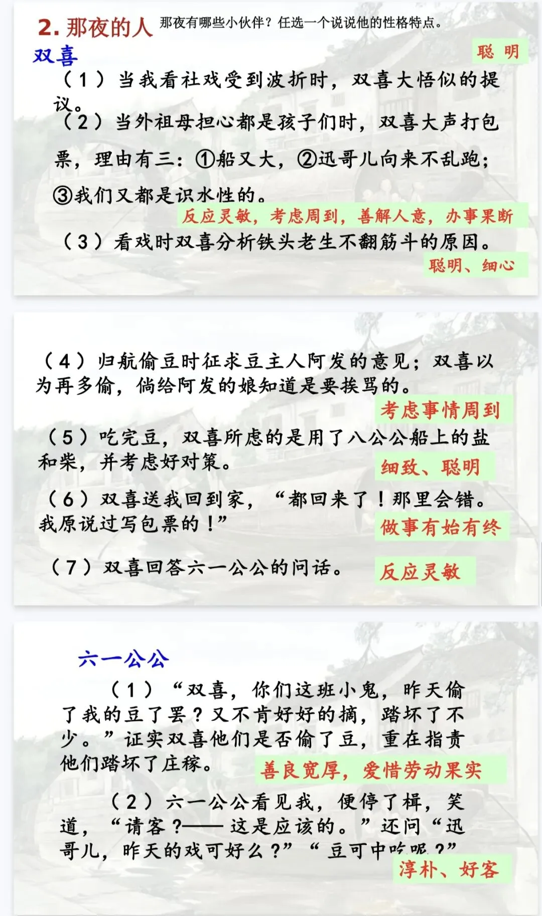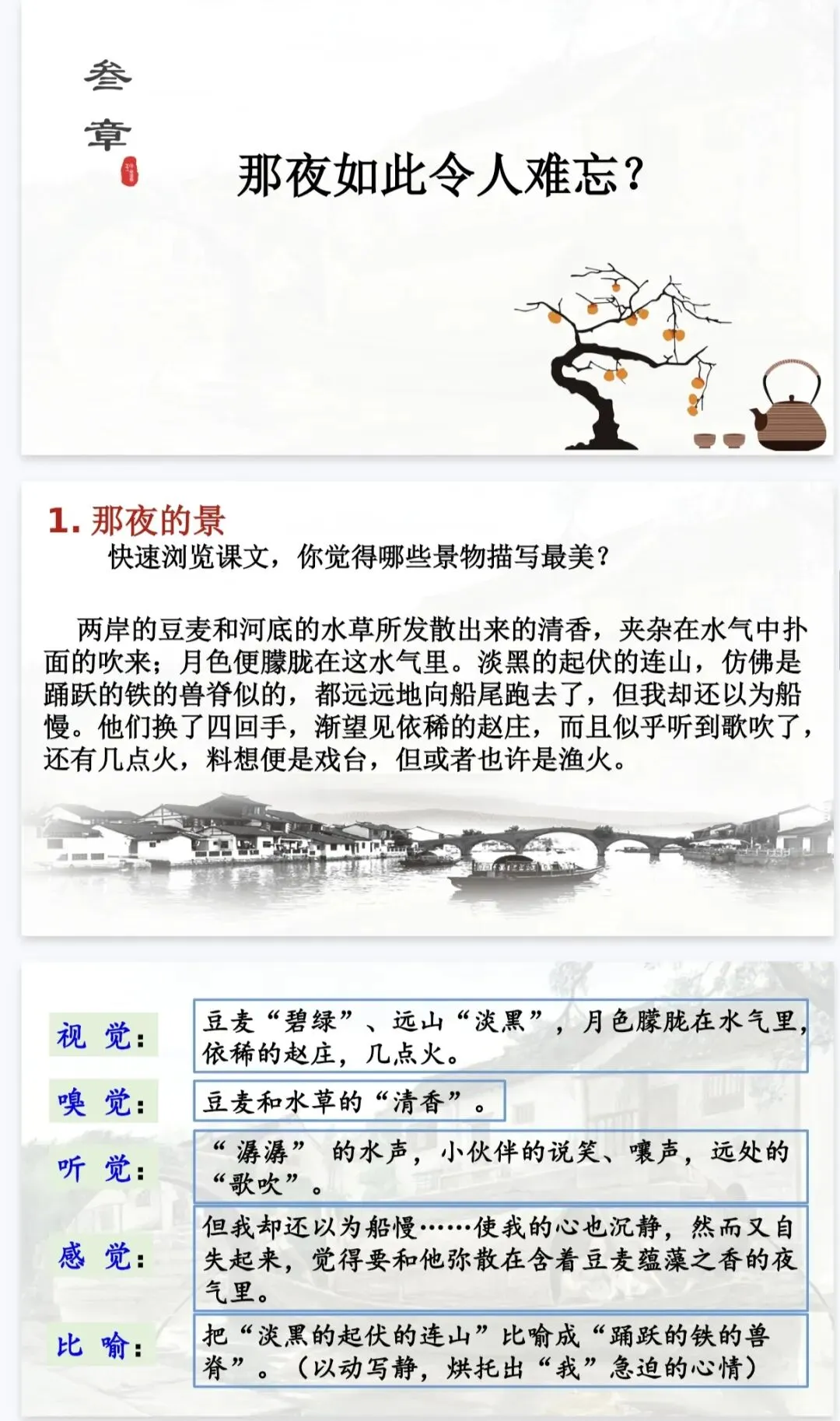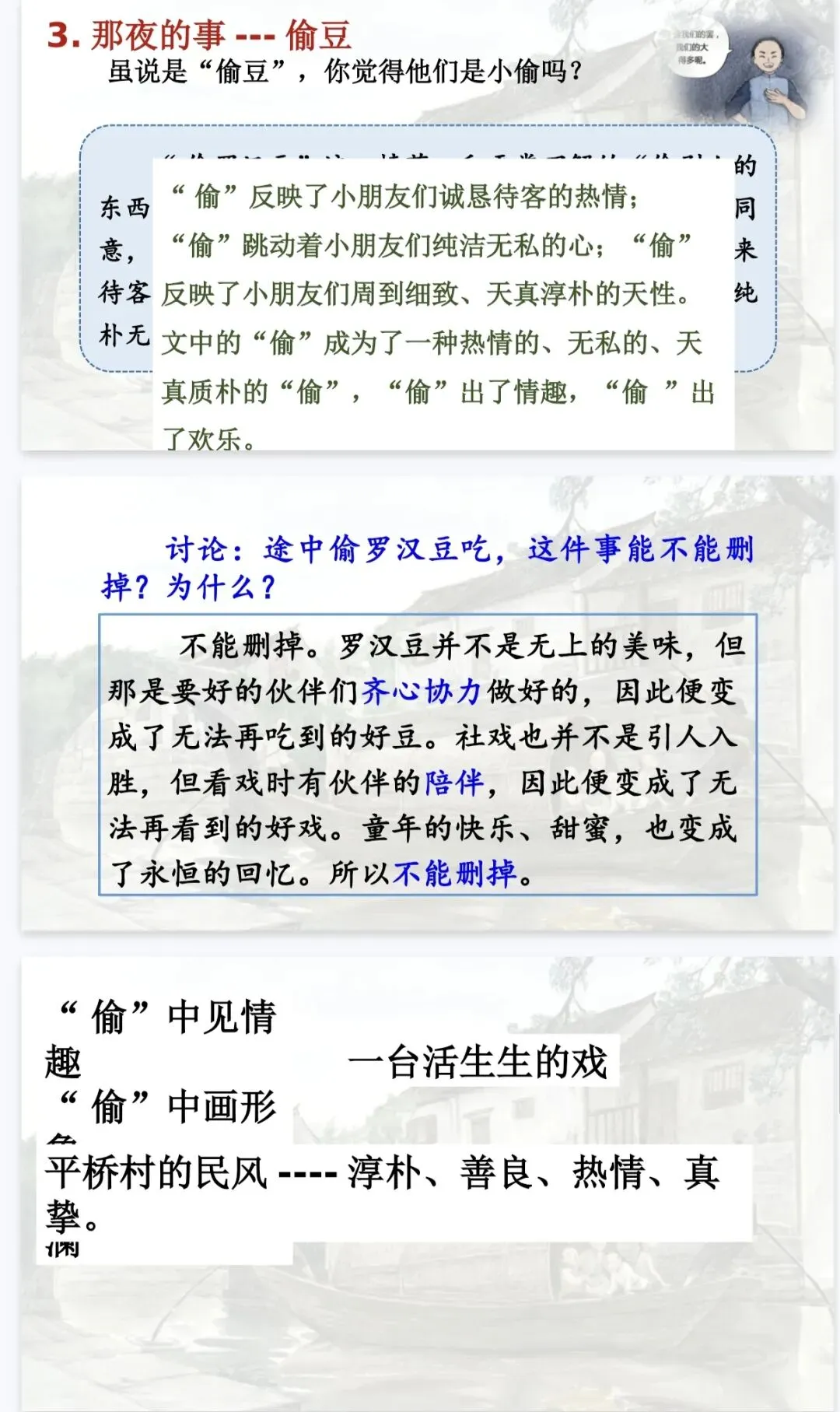 是那夜的事,是那夜藏在心底的温柔与深情。 这份《社戏》精品课件,正是为了帮你把这份“难忘”讲给学生听。它以“好豆好戏”为线索,从景、人、事三个维度层层深入,既有清晰的任务驱动框架,又有细腻的文本品读设计,让课堂既有温度又有深度。八年级语文老师备课,直接拿来就能用,帮你高效讲透鲁迅笔下的童年与乡愁!