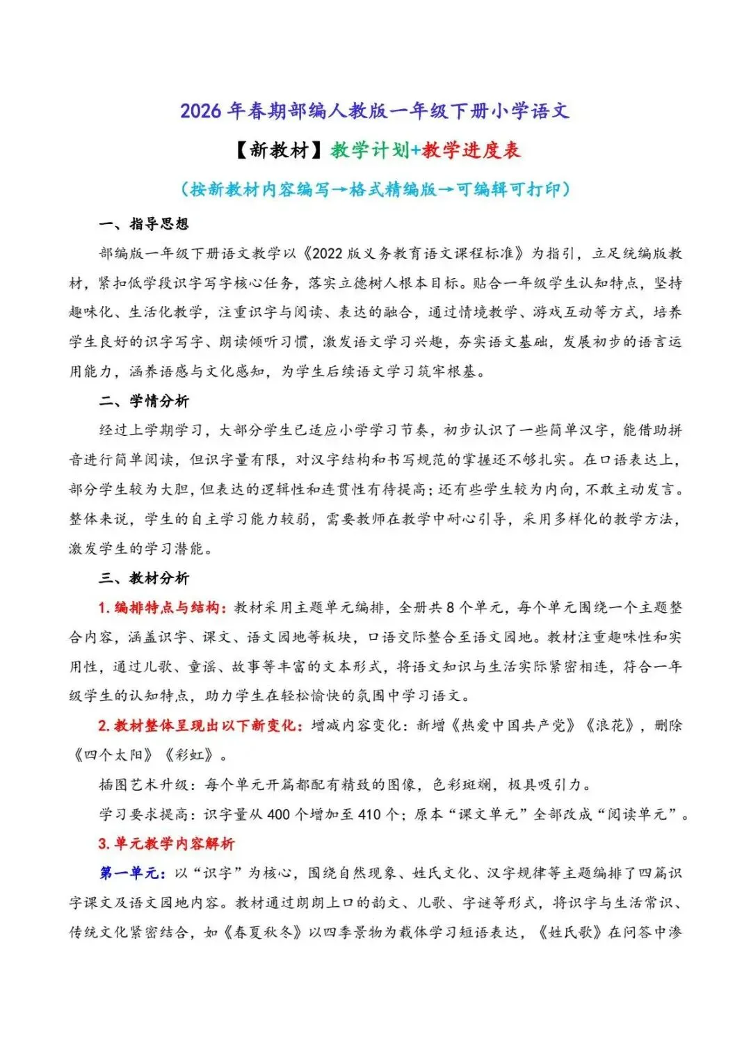 2026年春《一年级下册语文课件教案+教学计划+教学进度表合集》电子版可编辑可打印,同步新教材,核心素养+大单元教学教案