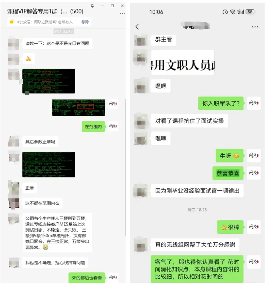 关于VIP1群呢,从20年5月到24年2月底正式满员,在创建这个VIP群的时候,就考虑过如果随着人数多的情况下,怎么能保障解答的质量呢,想了好久,决定就是提供解决问题的思路跟方向,告诉这个问题故障的点在哪,排查方向或者实现的思路,或者这个故障跟技术在我课程里面讲过,会直接提示看哪一篇可以解决,所以现在就算人数到了500,在答疑方面还是很及时的。当然也少不了群里朋友的帮忙解答,再次特别感谢萌新总、飞总、菜总、冯总、策总以及群里的朋友