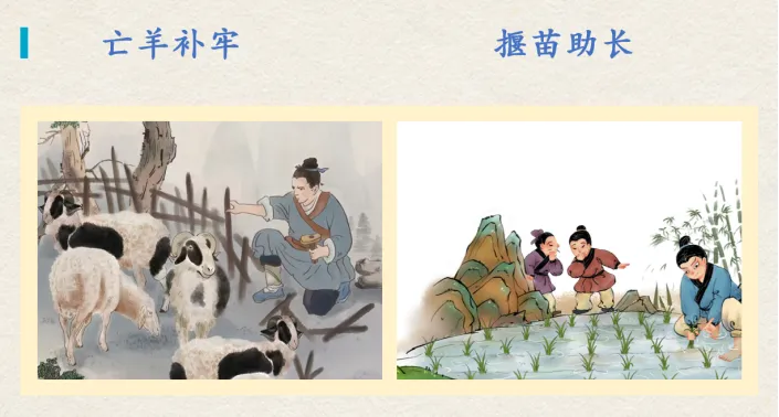 生:第一幅图片是亡羊补牢,第二幅图片是揠苗助长。师:答对了,而且表达的还非常有条理。这是我们上学期学过的两则寓言故事。寓言故事很好玩儿。