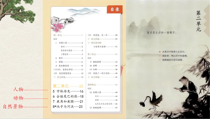 师:这些寓言故事看就像是一个魔袋,里边藏着故事情节、人物形象、蕴含的道理以及对人的启示。那今天这节课我们就要开启一场时空穿越之旅,共同走进第二单元,去打开世界寓言宝库的大门。在这个单元中,你还会学习一篇和人物有关的寓言故事,大家还会接触到和动物、自然景物相关的寓言。