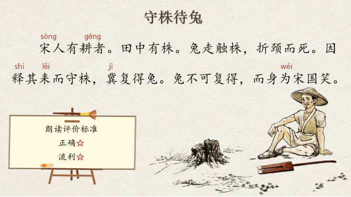 生:宋人有耕者。田中有株。免走触株,折颈而死。因释其来而守株,冀复得兔。兔不可复得,而身为宋国笑。师:你给他评几颗星?生:我给她评一颗星,因为她有两处读得结结巴巴的。师:虽然只得到了一颗星,但是老师要表扬你,“冀”字的读音你读的特别准。我请同学们再读读(出示词卡)——