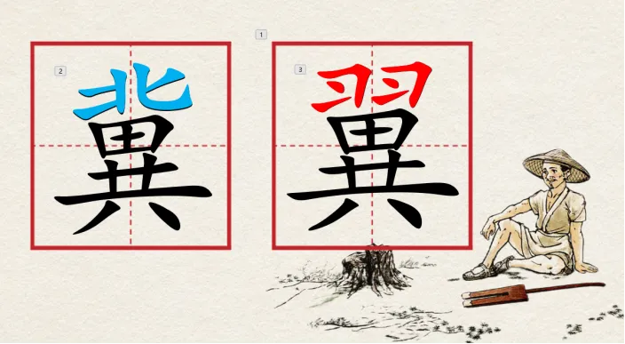 生:我发现了这两个字下面都是“田”和“共”,上面部分不一样,一个是“北”,一个是“羽”。