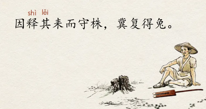生:于是农夫放下农具,去守树桩,想着兔子还会撞到树桩。
