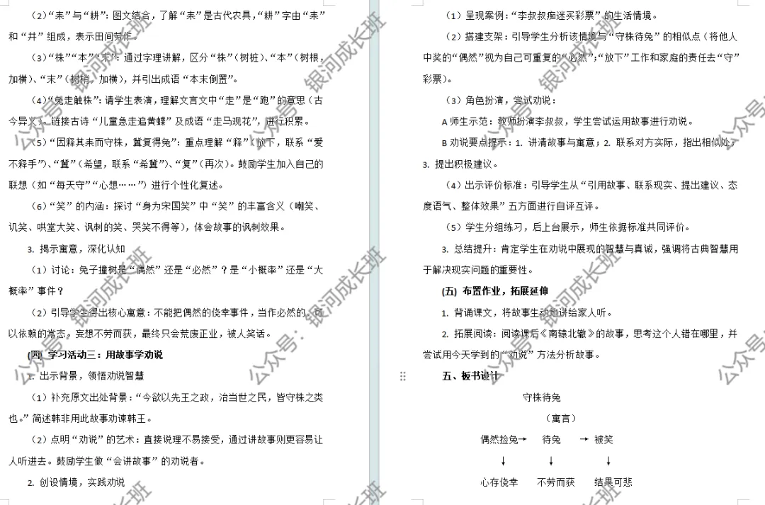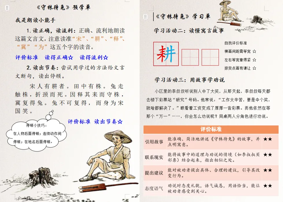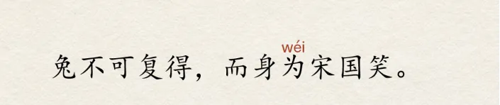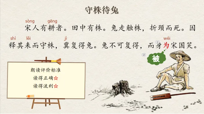 生:宋人有耕者。田中有株。免走触株,折颈而死。因释其来而守株,冀复得兔。兔不可复得,而身为宋国笑。师:2颗星非你莫属,掌声送给这位同学。这个“为”是多音字,你知道这里为什么读“wéi”吗?