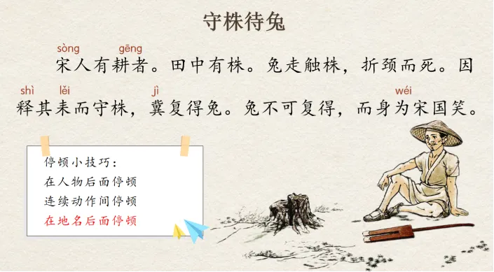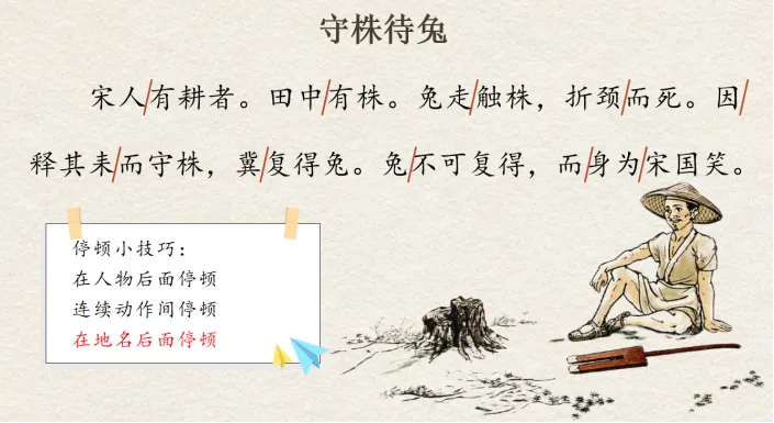 师:因释其耒而守株,冀复得兔。兔不可复得,而身为宋国笑。看这停顿,和老师画的一样的同学举手,发现有不一样的同学了,马上改过来。