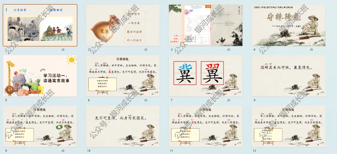 生:因释其耒而守株,冀复得兔。师:我们一起读——生:因释其耒而守株,冀复得兔。