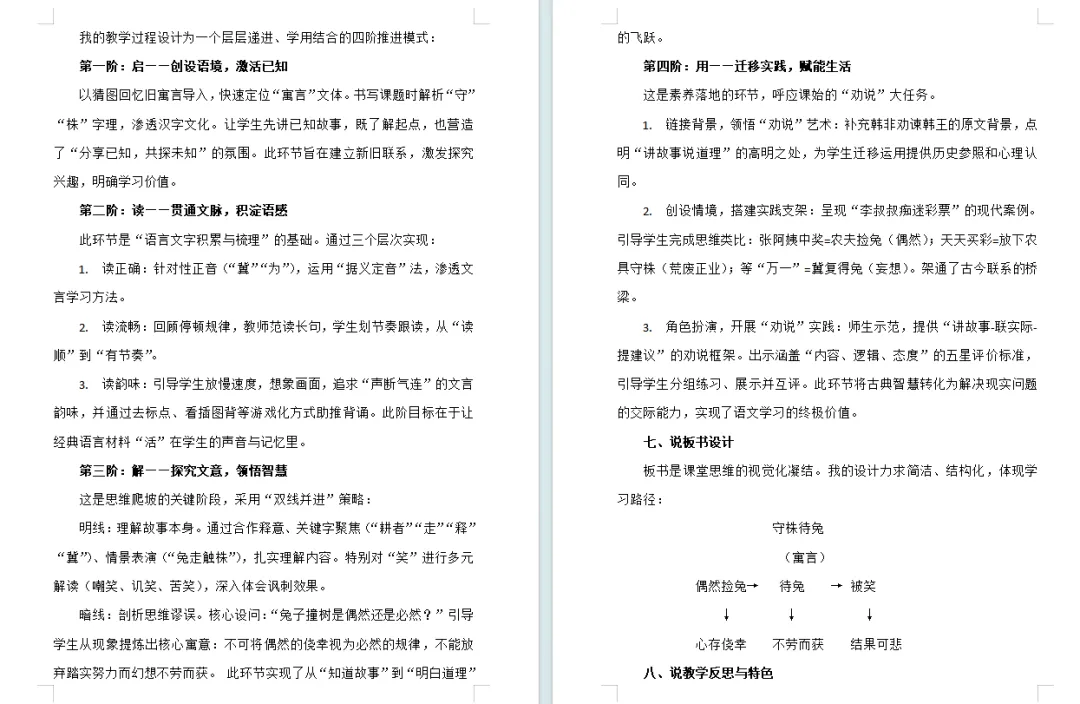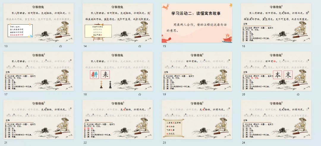 师:现在你能根据停顿符读出文言文的节奏吗?自己先练习一下。师:谁来试试?生:宋人有耕者。田中有株。免走触株,折颈而死。因释其来而守株,冀复得兔。兔不可复得,而身为宋国笑。师:节奏读得很准确。文言文特别有韵味,我们在读的时候还可以再稍微的慢一点。读文言要像品茶一般,只有慢慢去品才会有唇齿留香的感觉。师:谁再来试试?生:宋人有耕者。田中有株。免走触株,折颈而死。因释其来而守株,冀复得兔。兔不可复得,而身为宋国笑。师:你读出了文言文的韵味,让我们学着他的样子,一起来读——生:宋人有耕者。田中有株。免走触株,折颈而死。因释其来而守株,冀复得兔。兔不可复得,而身为宋国笑。师:这个节奏感把握得特别好,文言文要想有味道,我们首先得掌握好节奏,再做到声断气连,这个文言就会越读越有滋味。谁还想读读?生:宋人有耕者。田中有株。免走触株,折颈而死。因释其来而守株,冀复得兔。兔不可复得,而身为宋国笑。师:读得有滋有味的,我们学着他的样子,一起读读——生:宋人有耕者。田中有株。免走触株,折颈而死。因释其来而守株,冀复得兔。兔不可复得,而身为宋国笑。师:这篇文言一共有五句话,现在请同桌两人合作,借助注释说说每句话的意思。师:都说好了,我们来交流下,第一句话,宋人有耕者的意思,就是——生:宋国有一个耕者。师:耕者,用现在的话说就是?生:农民。师:农民或者说农夫,或者说——生:种田的人。师:你瞧,耕者就是农民、农夫或者说种田的人。宋国有一个种田的人,或者说种地的人。种地种田的人我们叫做耕者,那么打渔的人我们叫什么?生:渔夫。师:把夫换一个词——生:渔者。师:好,那跳舞的人叫什么?生:舞者。师:唱歌的人叫什么?生:唱者。师:哈哈哈,把唱换一个字。生:歌者。师:特别有学问的人叫什么?生:学者。师:好,像老师这样的人叫什么?生:师者。师:特别有智慧的人,我们可以叫——智者,所以者就是什么样的人。耕者就是种田或者种地的人,既然要耕,就必须要有农具。在这篇文言当中,哪个字表示的就是农具?生:耒。师:拿起笔在课文当中把这个古老的农具圈出来,圈好了吗?生:圈好了。师:我们一起来看,这就是耕者的耕,既然要耕田,我们必然还要有农具,这就是课文当中的“耒”。它好比是一把锄头,就是在田间劳作的一种农具的样子,那么我们拿起这种古老的农具在井田边劳作,这就有了“耕”这个字。这个字非常好理解,就是把“耒”和“井”合并到了一起,就表示劳作。我们来看第二句话,一起读——生:田中有株。师:看看老师的屏幕,哪个是株?生:是农夫前面的木桩。师:没错,课文当中有注解。中国汉字非常非常的神奇,株,表示树桩。我们来猜猜,如果我在木字这一竖最下面加一横,这个字读什么?生:本。师:就好比是树的根,如果我在木字的上方加一横,表示树梢的意思,这个字读什么?末。就是这两个字,本表示树根,一个是末表示树梢。这两个字放在一起有一个成语,谁知道?你来。生:本末倒置。师:一起读——生:本末倒置。师:比喻就是颠倒了主次了。瞧,中国汉字多么神奇,表示树桩,读——株;表示树根,读——本;表示树梢读——末。我们继续往后看。第三句话,读——生:兔走触株,折颈而死。师:我请一个小朋友来表演一下兔走触株,谁来试试?现在这样,你就是兔,我就是株。来,表演一下兔走触株。生:表演。师:你刚刚怎么表演“兔走触株”?生:我是兔子撞到树桩,脖子扭了一下。师:你是怎么过来的?生:蹦着跳着。师:蹦着跳着还不是“走”的意思,你再表演一下这个“走”到底是什么意思?生:跑。师:好,站住,这就是什么?跑。那我现在请你走到座位上,这个“走”指的是?生:走路。师:汉字多有趣,在文言文中,走不是行走,而是——生:跑。师:这是一种特殊的语言现象,叫做古今异义。这种古今异义的语言现象,在古诗,成语中也有,让我们一起来读一读——生:儿童急走追黄蝶。生:奔走相告飞禽走兽走马观花师:所以说我们的文言其实并没有在生活当中消亡,它是已经慢慢的渗透到我们的语言习惯当中,慢慢地渗透到我们的血液当中,成为我们每天在说话当中必用的词汇,只是大家没有太注意。正因为兔子跑的速度太快了,所以才有了触株折颈而死。那触株的意思就是——生:撞到树桩。师:对,撞就是触的意思。速度太快了才会——折颈而死。指指自己的颈,你指的哪里?生:脖子。师:所以“颈”指的就是?生:脖子。师:谁能连起来说说“兔走触株,折颈而死”的意思?生:一只兔子跑的太快了,撞到树桩上,脖子断了,被撞死了。师:我们一起来读第三句话——生:兔走触株,折颈而死。师:我们来看第4句话。谁来说说它的意思?