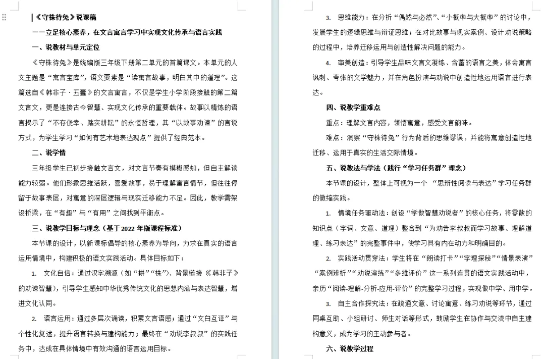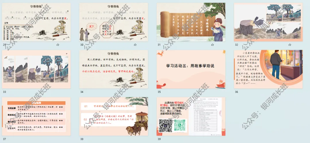 师:首先我们来到第一站,去结识战国时期那位守株待兔的农夫。齐读课题——生:守株待兔。师:这则寓言故事距今已有2, 000 多年了,而且它是以文言的方式去呈现的,出自于《韩非子.五蠹》。文言文,是我们中国语言最宝贵的财富,同学们伸出手,和老师一起恭恭敬敬地把课题写下来。第一个字,“守”,宝盖头最早读“mián”表示家的意思,下面的“寸”就是手,门里有只手表示的是守护的意思。株也是这课的生字。“株”是一个典型的形声字,左边的木表示——树桩,右边表示读音。“待”双人旁,右边多横要 注意长短有变化,间距留白要匀称。一起读课题——守株待兔。师:《守株待兔》是一个家喻户晓的故事,你们没有读文言之前,或多或少都听过这个故事。那谁能给大家讲一讲守株待兔这个故事?你以前怎么听的就怎么讲,你来。生:宋国有一个农夫,他的田中有一个树桩,一只兔子跑过来撞到了树桩,脖子断了,死掉了。农夫放下手中的农具,在树桩旁等待还有没有兔子来撞死。兔子不能再得到了。他也成为了宋国的笑话。师:他也成为了别人眼中的笑话,他好像是看着这篇文言在去翻译。总之这个故事我们之前或多或少都听过。所以实际上在学文言的时候并不难。老师觉得这篇文言真的是非常非常简单,因为它一共只有几句话,一起说,几句话?生:五句话。