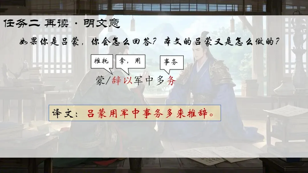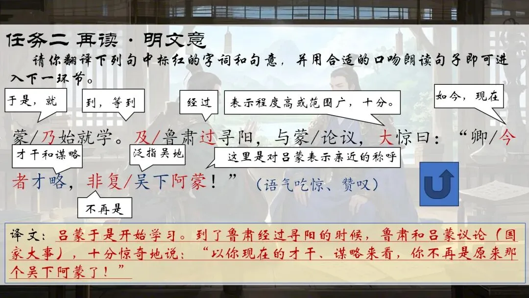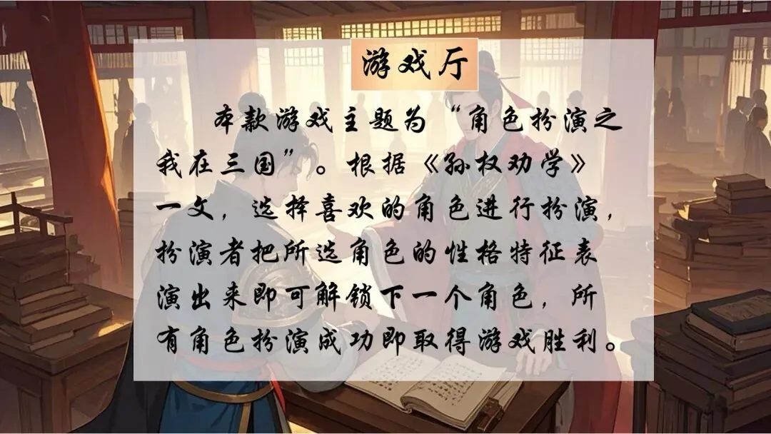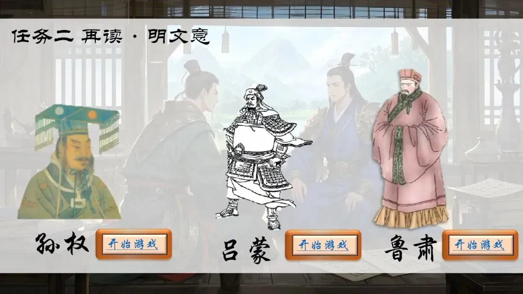 🚩情境思路:角色扮演之我在三国——根据《孙权劝学》一文进行角色扮演,让学生从孙权、吕蒙、鲁肃三个人物中进行选择,主要是扮演朗读语气,成功读出句子意思即可进入下一个人物扮演,朗读语气全部模仿成功即可获得胜利。其中穿插字词翻译、句子翻译,这样就不会那么无聊啦~在选择三个人物时,任选其中一个都可以页面跳转哦~