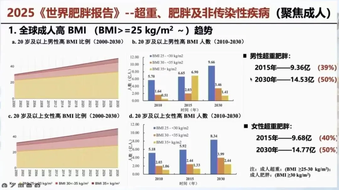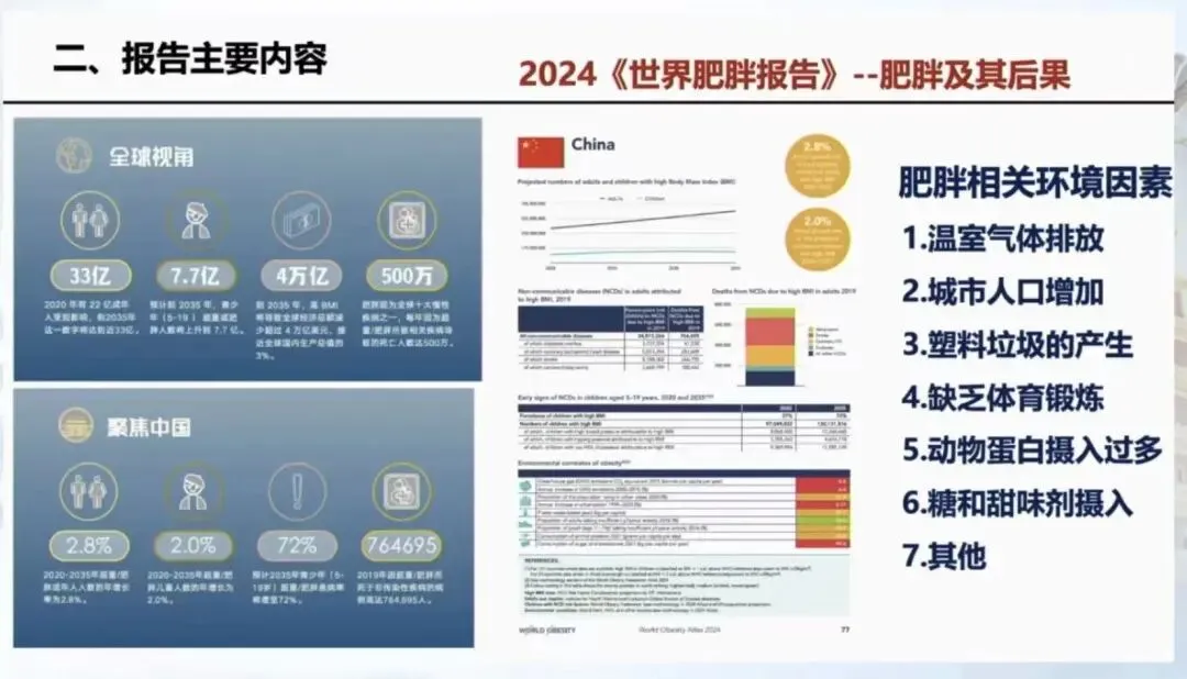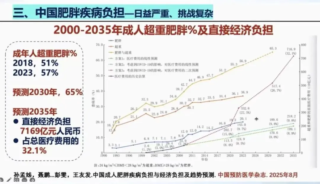 肥胖流行已成为全球和我国重大健康挑战。我国约57%的成年人和约30%的学龄儿童患有超重或肥胖,近30年来超重肥胖患病率逐年攀升。肥胖不仅是一种慢性代谢性疾病,更是引发多种疾病的重要危险因素。预计到2035年,全球约50%和40亿人口将患有超重或肥胖。世界肥胖联盟向全球80亿人发出行动呼吁:同心协力,共同改写肥胖问题的未来。