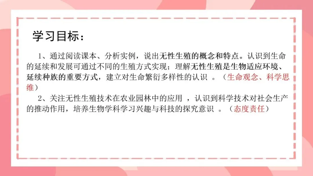 1.生命观念:说出无性生殖的概念和特点,认识生命繁衍的多样性,理解无性生殖是生物适应环境、延续种族的重要方式。