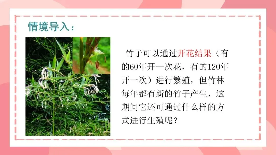 1.教师提问:“竹子有的 60 年甚至 120 年才开一次花结果,但竹林每年都有新竹子长出,大家思考一下,除了开花结果,竹子还能通过什么方式繁殖后代?”