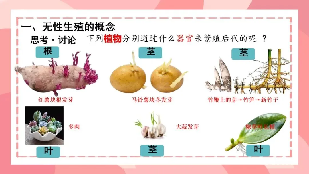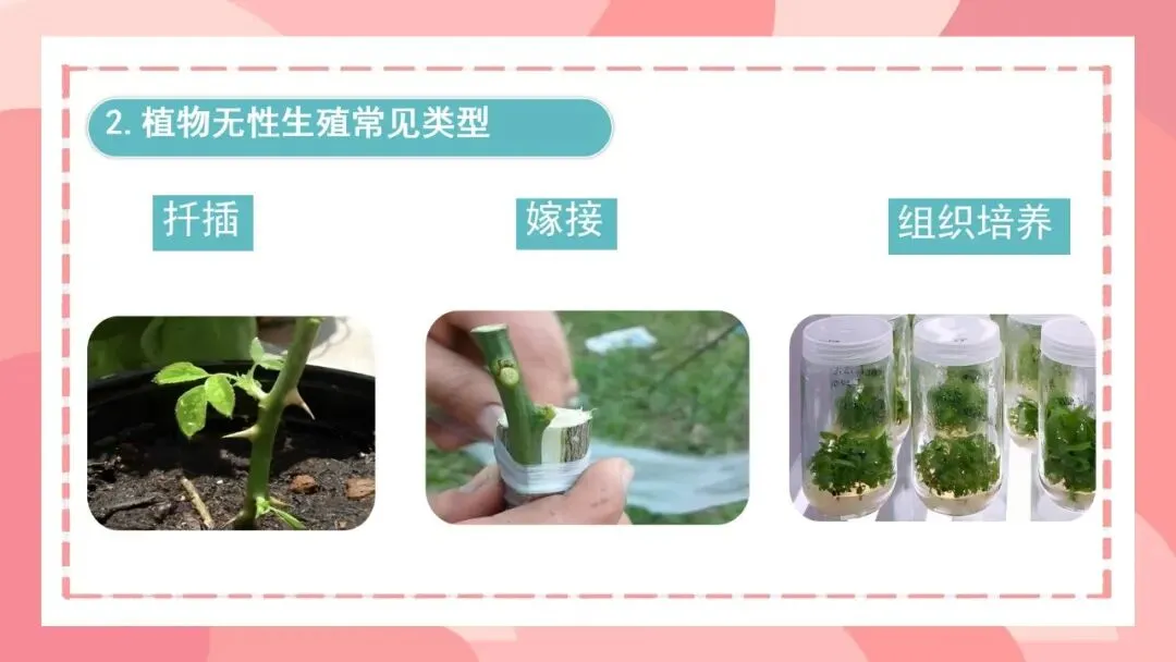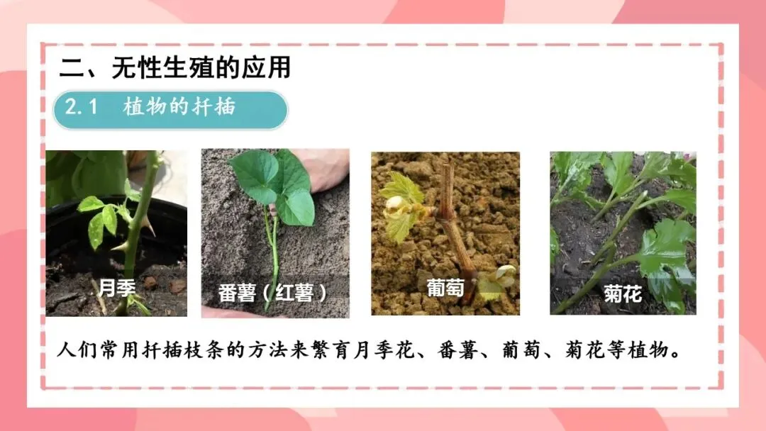本环节围绕“无性生殖在生产中的具体应用” 展开,重点讲解植物无性生殖的三种方式,结合实例、模型和问题探究突破难点。