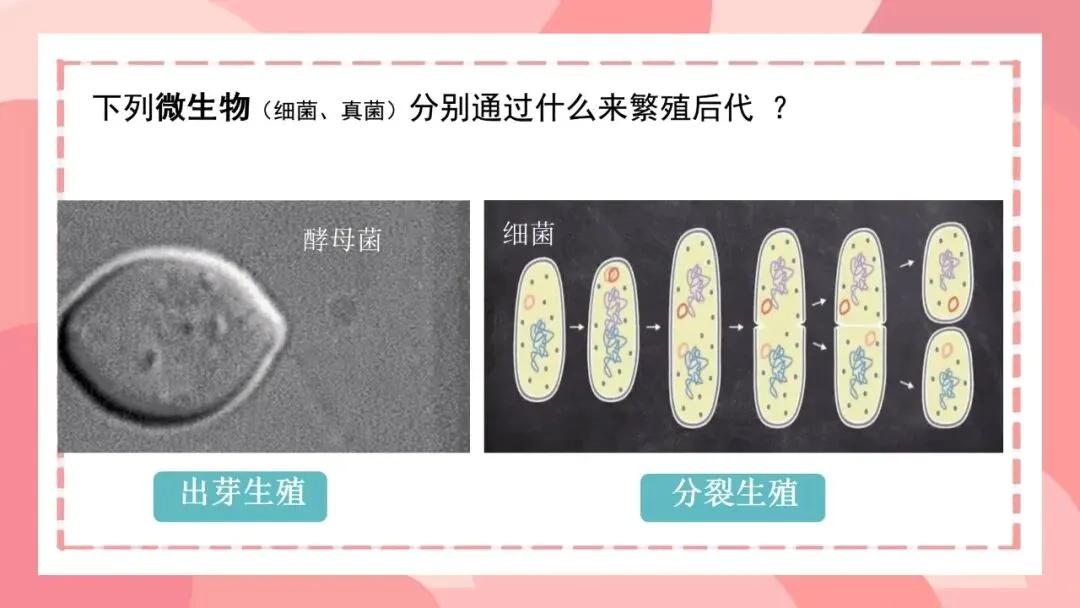 2.动物 / 微生物:分裂生殖(细菌、草履虫)、出芽生殖(水螅、酵母菌)。