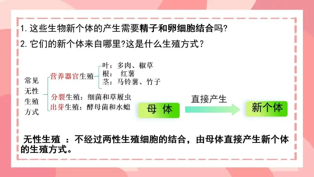 2.核心问题引导,提炼概念教师提出两个核心问题,组织全班交流:(1)这些生物新个体的产生需要精子和卵细胞的结合吗?(不需要)(2)它们的新个体都来自哪里?(母体)结合学生回答,总结无性生殖的概念:不经过两性生殖细胞的结合,由母体直接产生新个体的生殖方式。