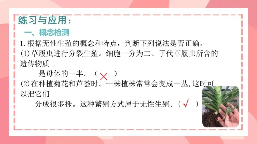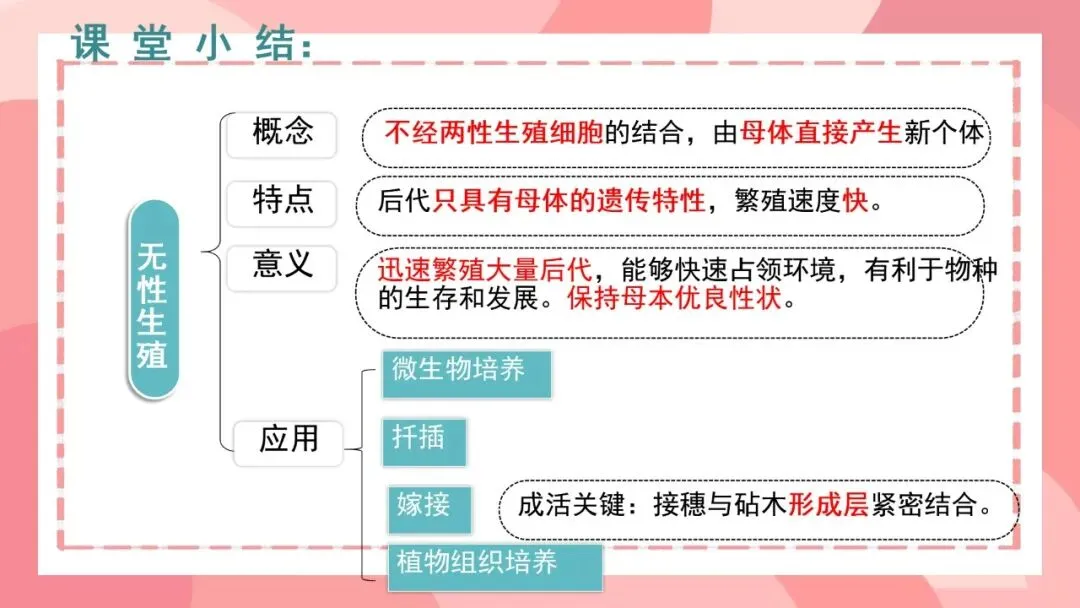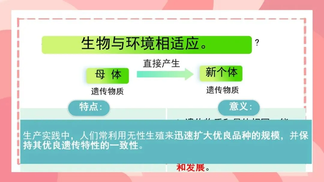 2.总结无性生殖特点:课件呈现核心特点——繁殖速度快、后代遗传特性与母体一致。