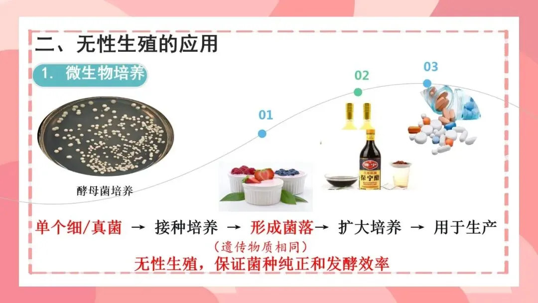1.微生物培养:简单讲解原理—— 利用无性生殖使菌种遗传物质相同,保证菌种纯正和发酵效率,为生产提供稳定的微生物来源(如酵母菌培养)。