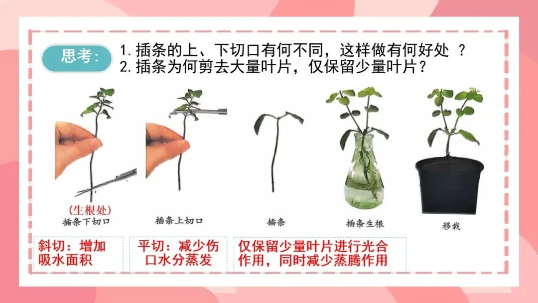 3.科学探究:结合扦插、嫁接的操作要点,提出问题并分析原因,培养探究意识和解决实际问题的能力。