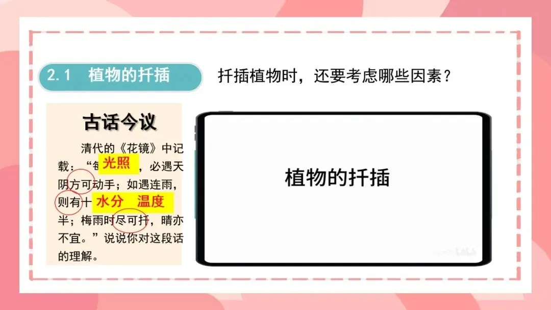 2.植物的扦插(1)实例介绍:列举月季、红薯、菊花、葡萄等常见扦插植物;(2)操作要点探究:展示扦插枝条示意图,提出问题引导学生讨论:① 插条上切口平切、下切口斜切的原因?(平切减少水分蒸发,斜切增加吸水面积)② 为何剪去大量叶片,仅保留少量?(减少蒸腾作用散失水分,少量叶片进行光合作用提供营养)(3)环境因素分析:引用清代《花镜》中 “光照,必遇天阴方可动手;梅雨时尽可扦,晴亦不宜”,让学生解读,总结扦插需要考虑光照、水分、温度等环境条件。