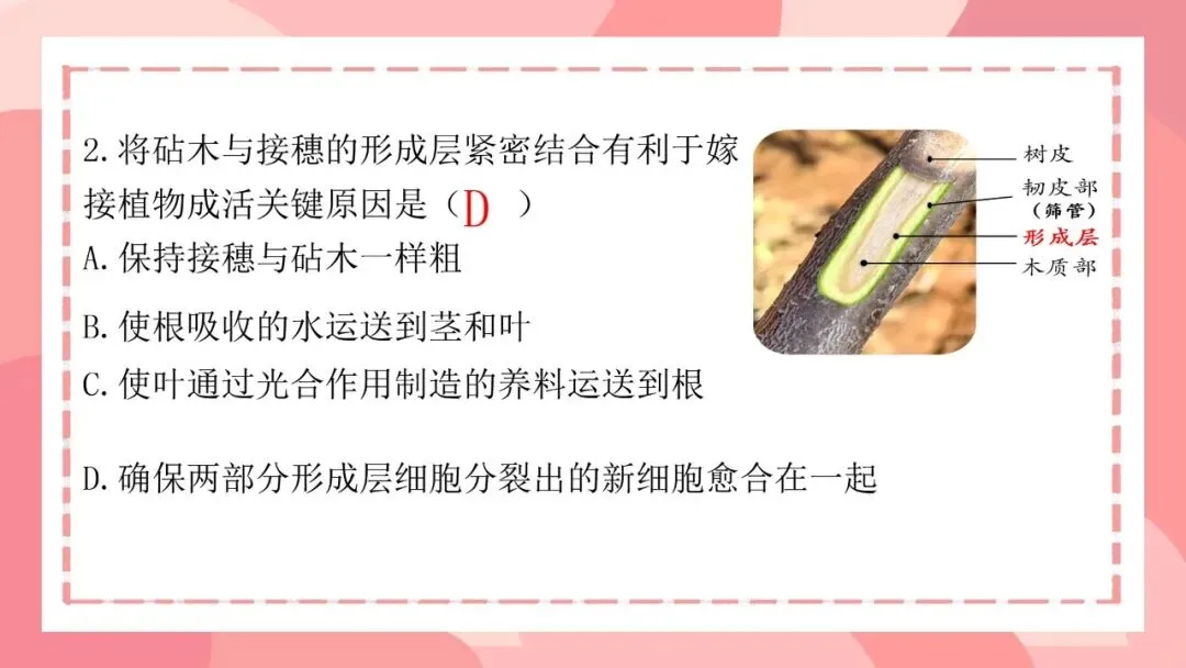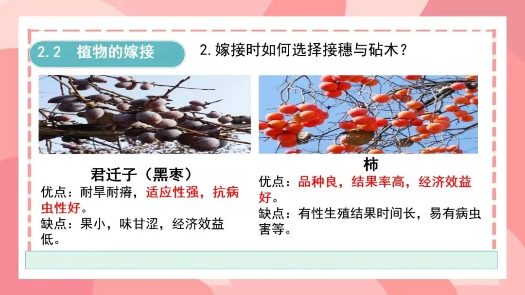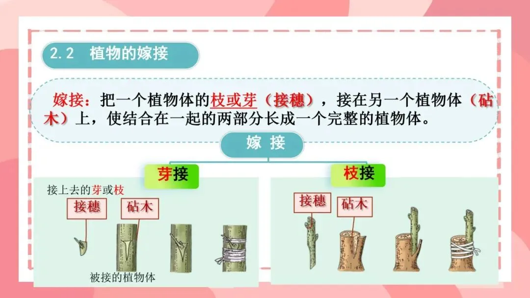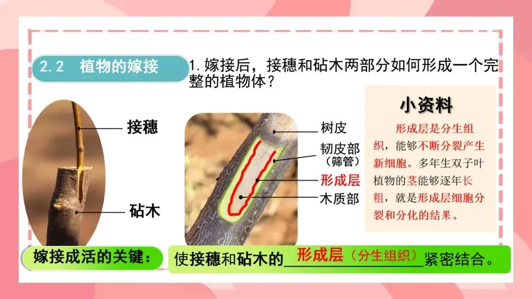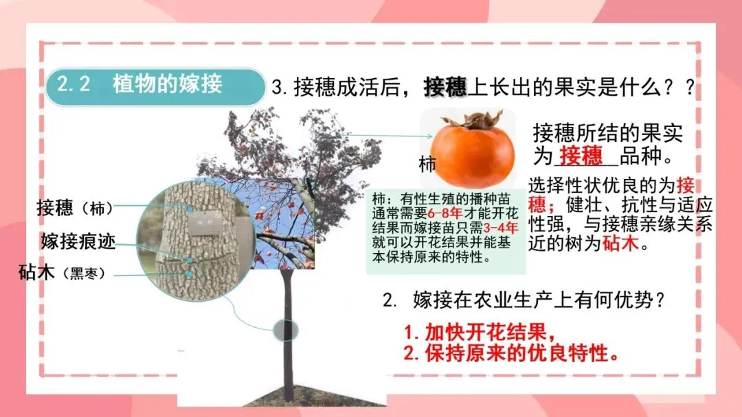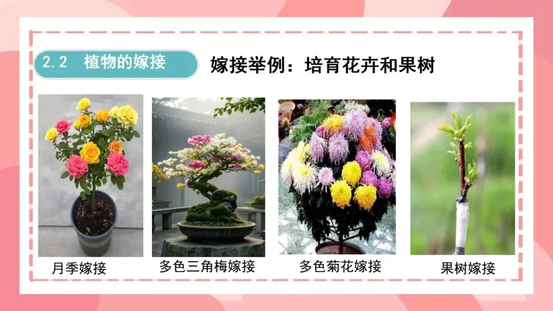 3.植物的嫁接(教学难点)(1)明确概念:嫁接是把一个植物体的枝或芽(接穗),接在另一个植物体(砧木)上,使二者长成一个完整植物体,分为芽接和枝接;(2)突破成活关键:展示植物茎横切面模型,讲解形成层是分生组织,能不断分裂产生新细胞,得出嫁接成活的关键:使接穗和砧木的形成层紧密结合;(3)接穗与砧木的选择:结合柿树嫁接黑枣的实例,分析接穗(柿树,性状优良、结果率高)和砧木(黑枣,耐旱耐瘠、抗病虫)的选择标准 —— 接穗选性状优良的品种,砧木选健壮、抗性强、与接穗亲缘关系近的植株;(4)应用优势与实例:总结嫁接优势(加快开花结果、保持母本优良特性),展示多色三角梅、多色菊花、果树嫁接的图片,让学生直观感受应用价值。