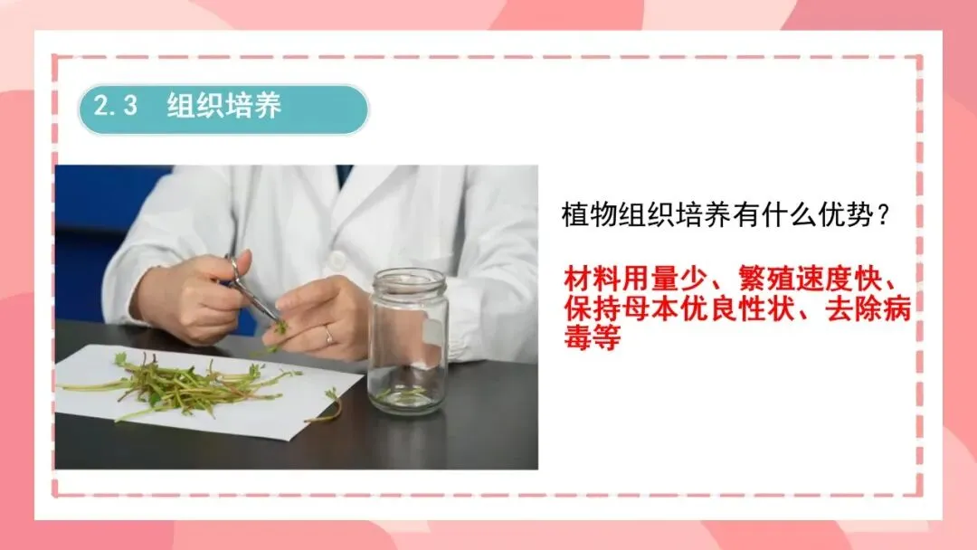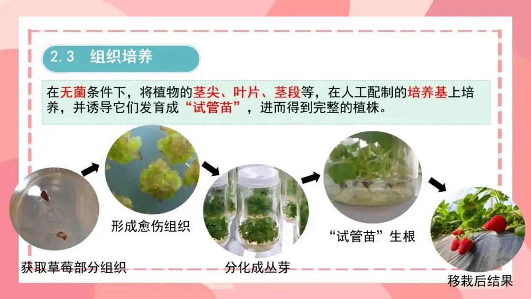 4.植物的组织培养(1)操作过程:课件展示草莓组织培养的步骤 —— 获取组织→形成愈伤组织→分化丛芽→试管苗生根→移栽结果,强调无菌条件和人工配制培养基;(2)优势总结:引导学生归纳组织培养的优点 —— 材料用量少、繁殖速度快、保持母本优良性状、去除病毒。