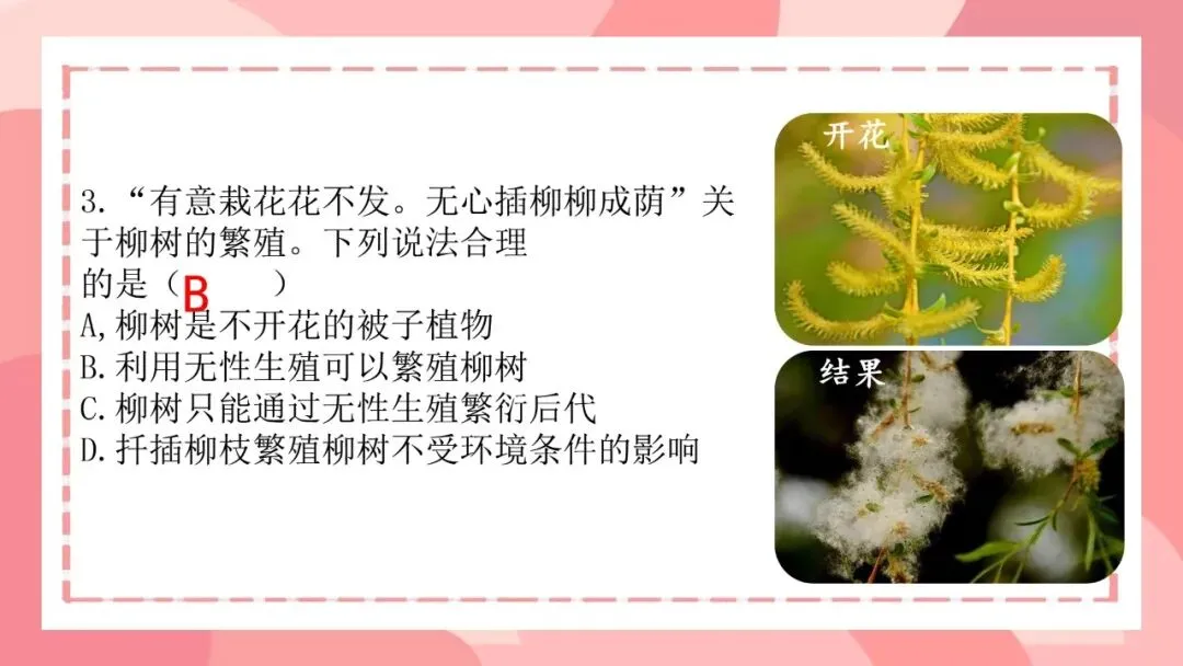 2.拓展思考:提出问题“为什么农业生产中常利用无性生殖繁殖优良果树品种,而不是用种子繁殖?”,让学生结合无性生殖的特点回答,强化知识应用能力。
