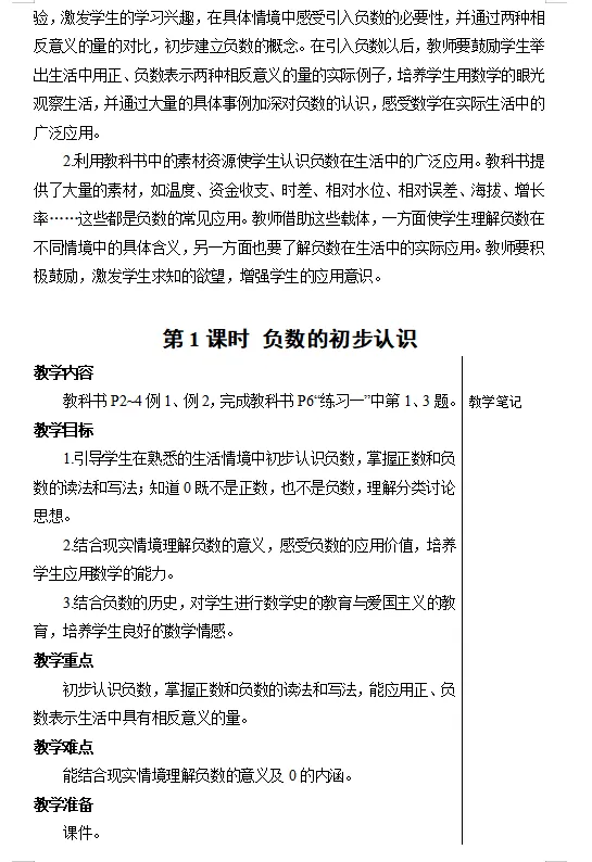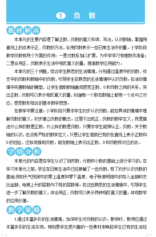 第一周 | 第一单元负数 | 1. 负数的认识 2. 解决问题 3. 练习课 | 5课时 机动1课时 |