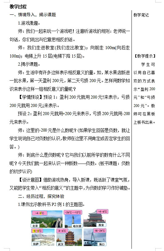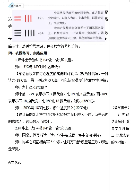 在数与代数方面,这一册教材安排了负数和比例两个单元。结合生活实例使学生初步认识负数,了解负数在实际生活中的应用。比例的教学,使学生理解比例、正比例和反比例的概念,会解比例和用比例知识解决问题。