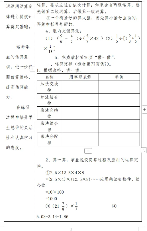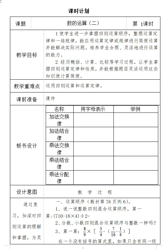 第十一周 | 整理和复习 | 1.数的认识(1) 2.数的认识(2) 3.数的运算(1) 4.数的运算(2) 5.练习课 | 5课时 机动1课时 |