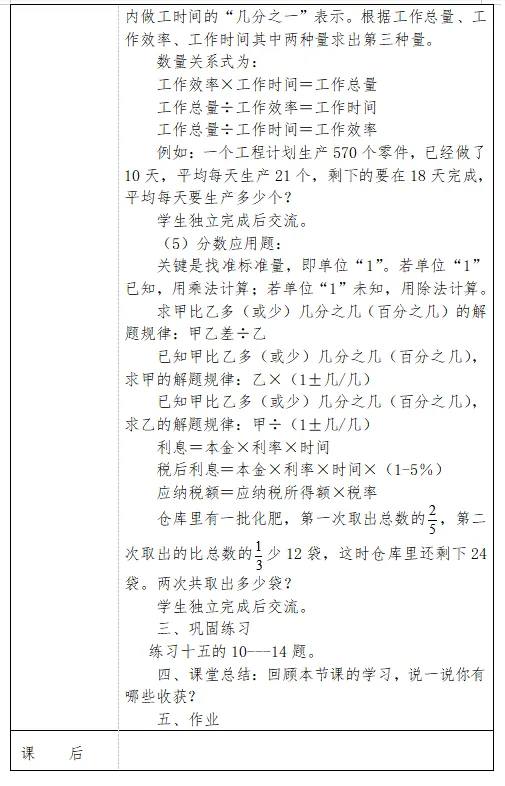 教学重点:百分数的应用、圆柱的侧面积和表面积的计算方法、圆柱和圆锥的体积计算方法、比例的意义和基本性质、正比例和反比例、扇形统计图、转化的解题策略以及总复习的四个板块的系列内容。