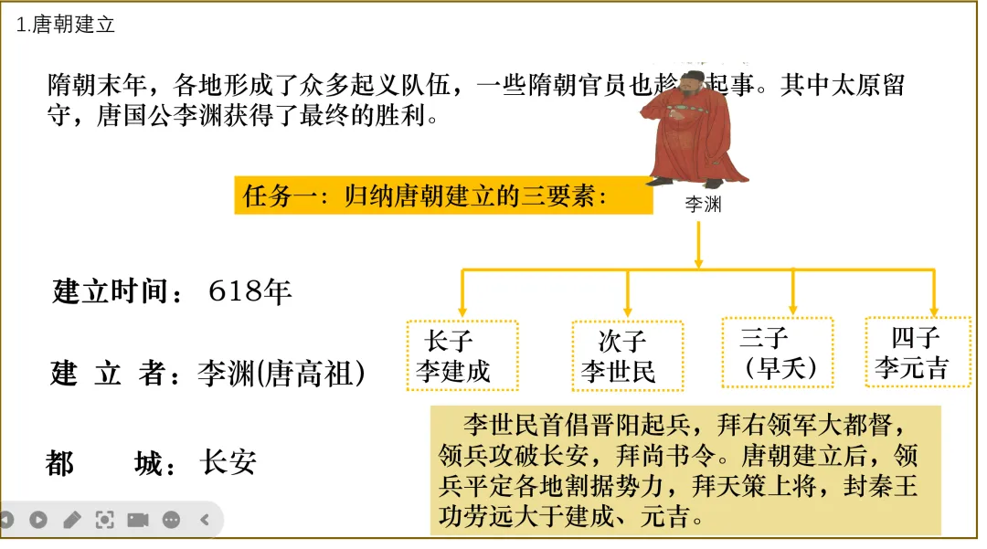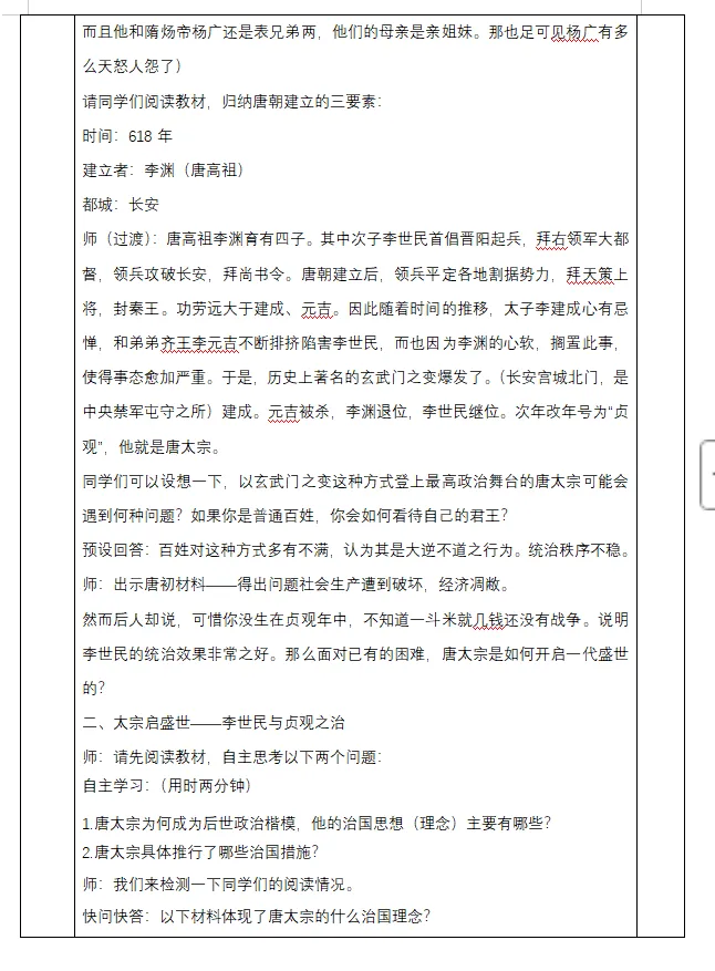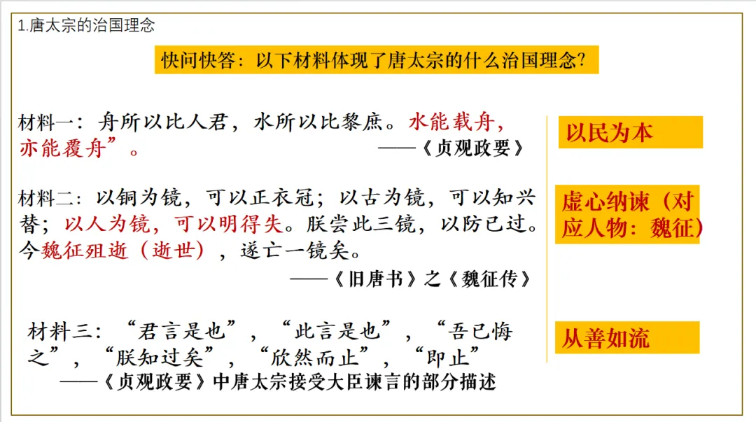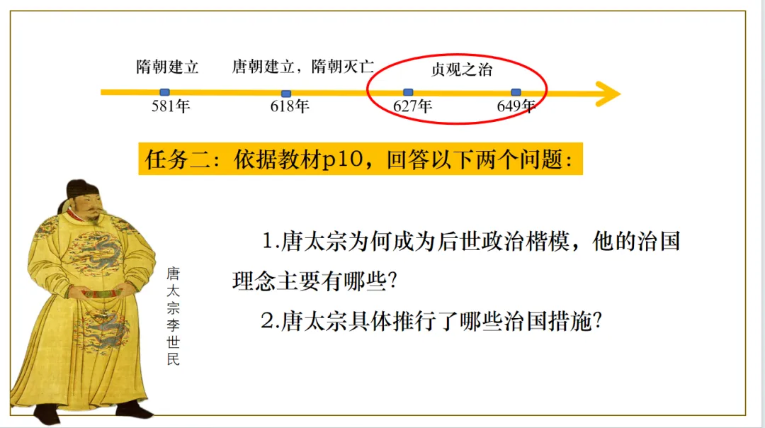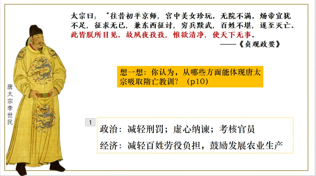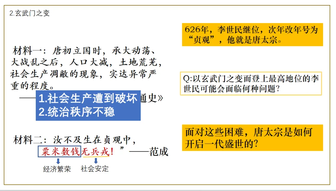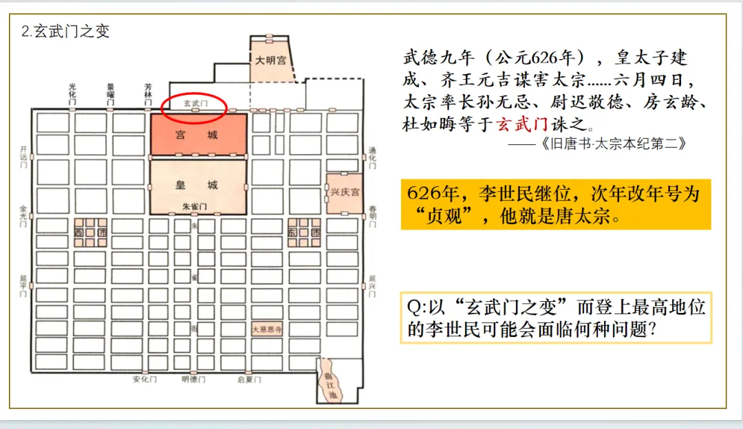 本节课的重点一定是在于“贞观之治”,唐太宗是中国历史上比较偏向儒家学者心目中理想的这样一个帝王。但其明明是通过文人所不齿的“玄武门政变”上台的,那为什么这个污点似乎对他没有影响呢?