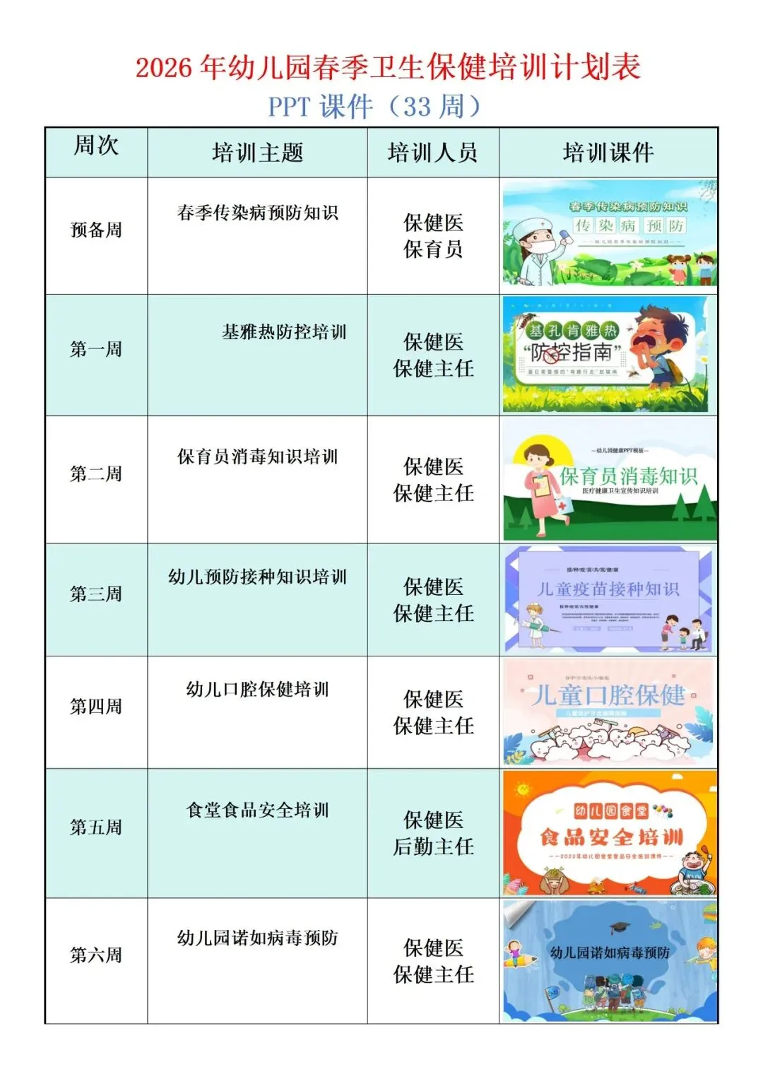2026年幼儿园春季卫生保健培训PPT课件+计划表(33周)