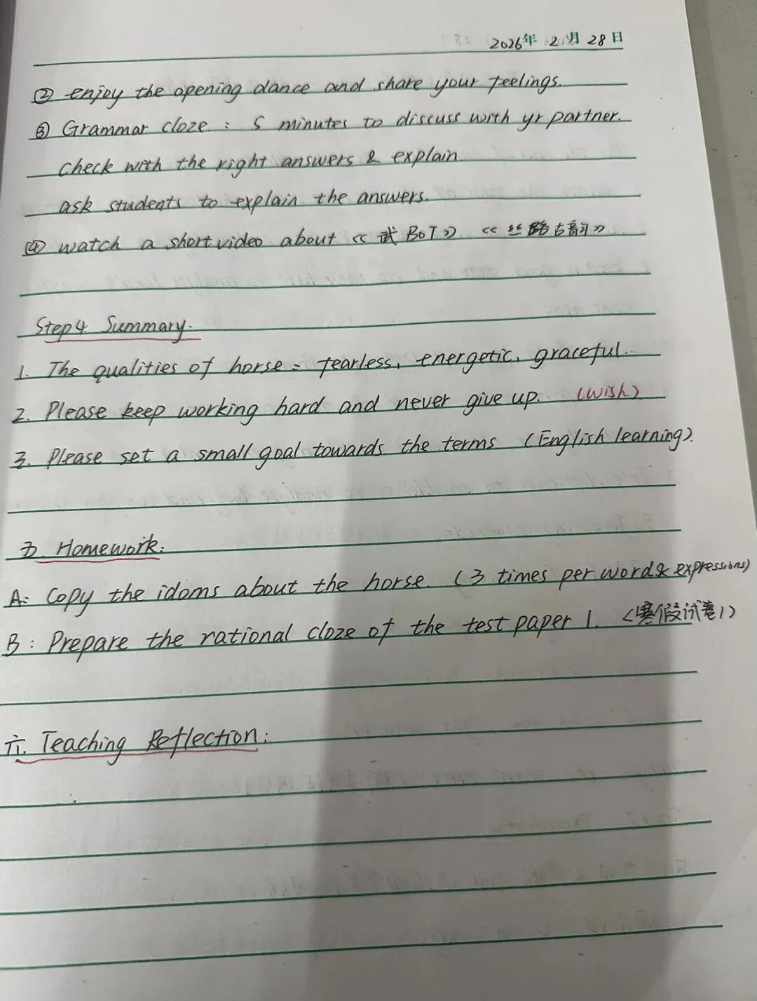 5.积累好读后续写写作好词好句和万能句的背诵和默写,及时对学生平时的学习情况做好记录与反馈。