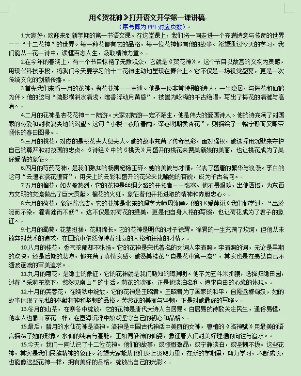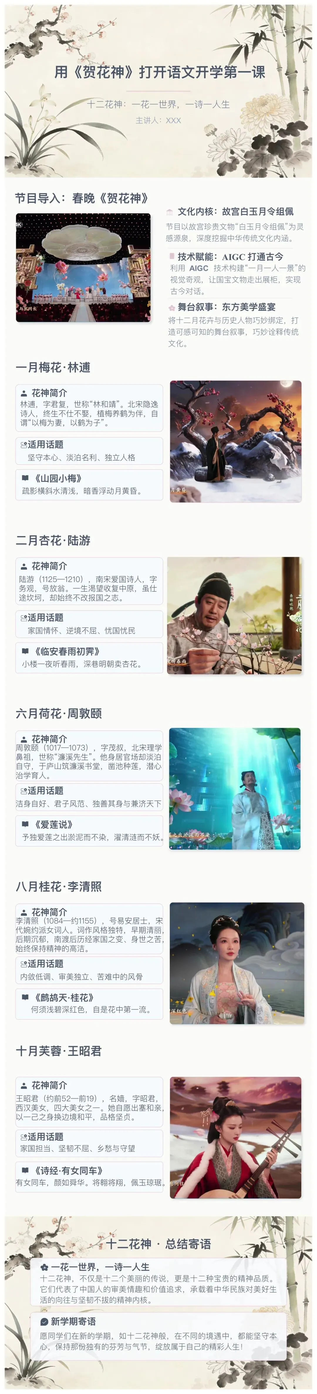 新学期语文开学第一课还在愁选题?让我们用《贺花神》点燃课堂兴趣,打开语文开学第一课!以一月一花一神为脉络,串联林逋、陆游、张骞、李清照等十二位历史人物,融合古典诗词、人物风骨、文化意象,让学生在东方美学中读懂文人精神、拓展作文素材,温习经典诗文。