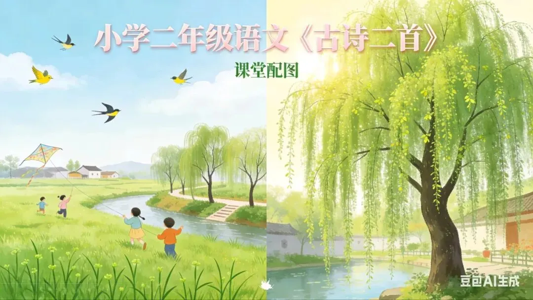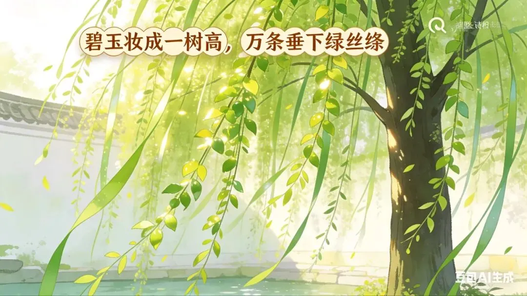 “碧玉妆成一树高”对小朋友来说很抽象——“碧玉”是什么?“万条垂下”有多密?光靠解释,不如直接“看柳树”。