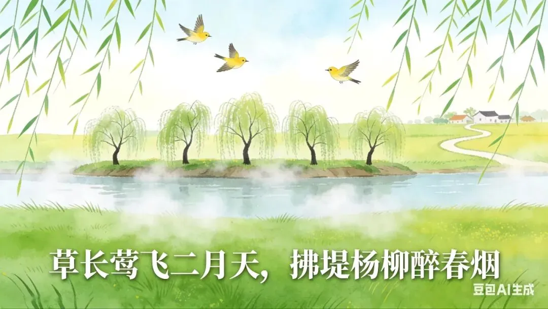 环节1:新授——用AI生成《村居》的“春景图”(对应诗句:草长莺飞二月天,拂堤杨柳醉春烟)