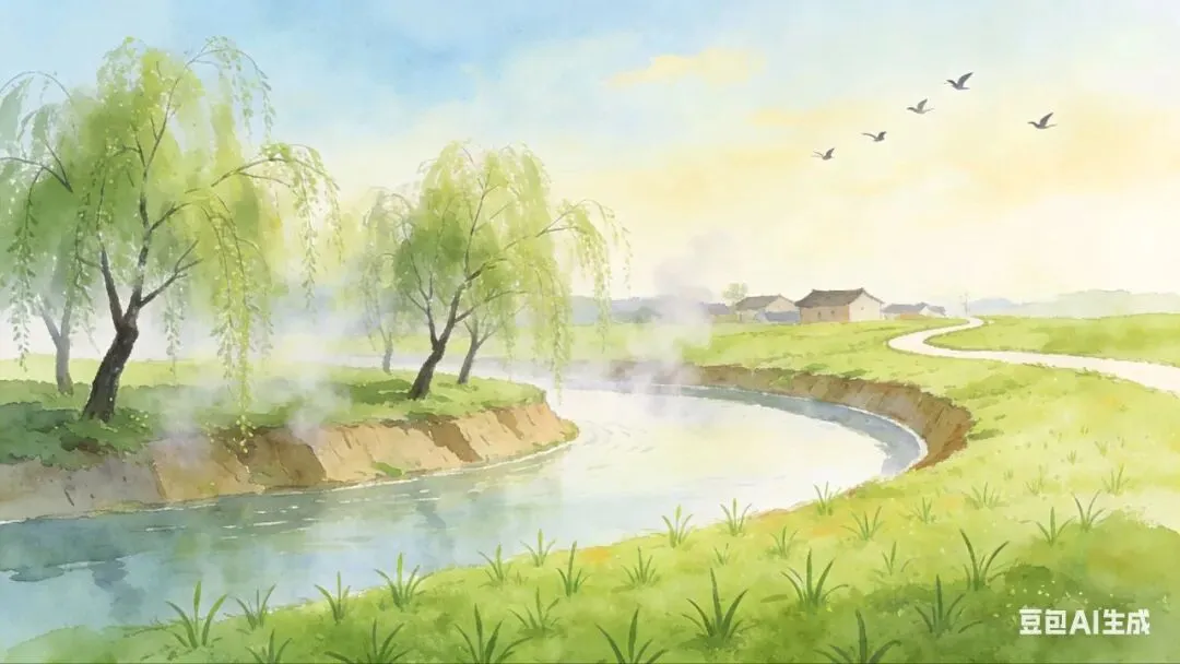 画面里必须包含:嫩绿的草地(小草在长高)、天空中飞着的黄莺(2-3只)、河堤边的杨柳(柳枝柔软,轻轻拂着堤岸)、一条小河(水面有淡淡的雾气/春烟)、远处的农舍和小路。