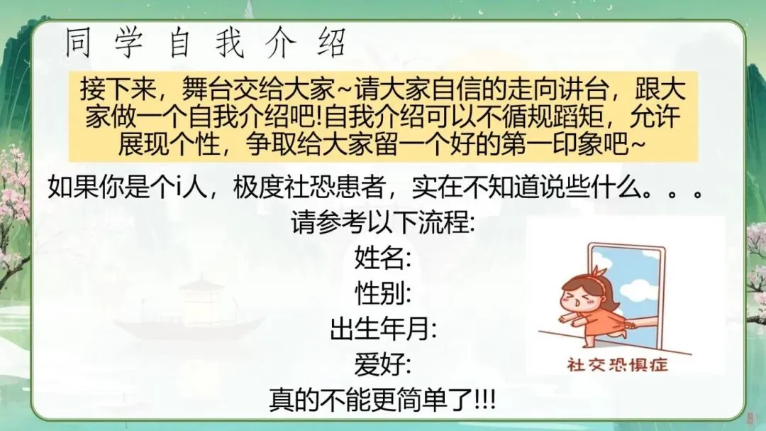 ✅ 学生互动引导贴心:包含“社恐友好型”自我介绍模板,轻松破冰,氛围拉满!