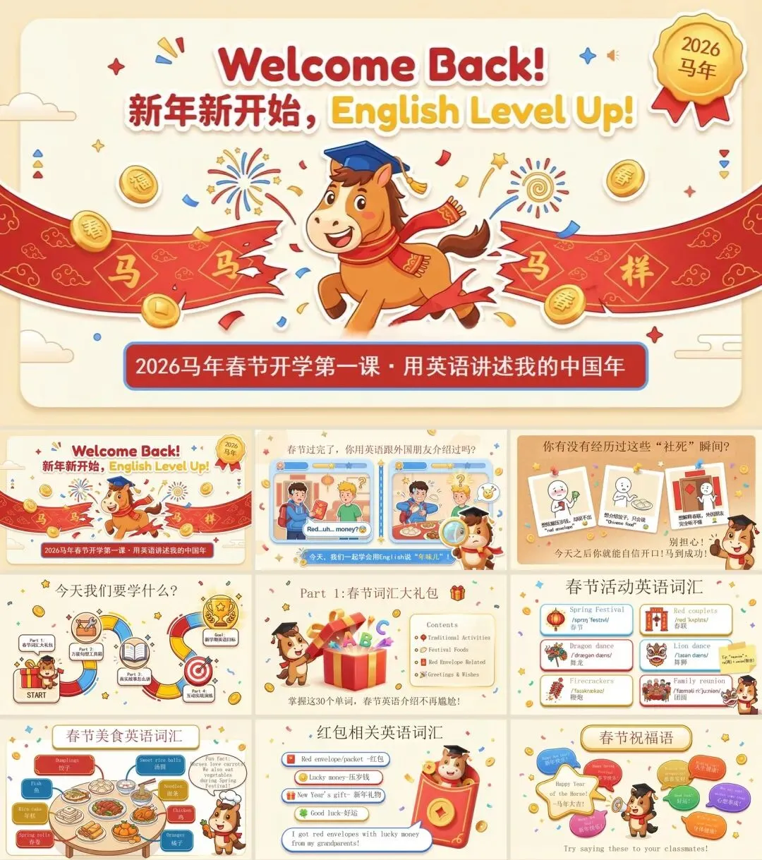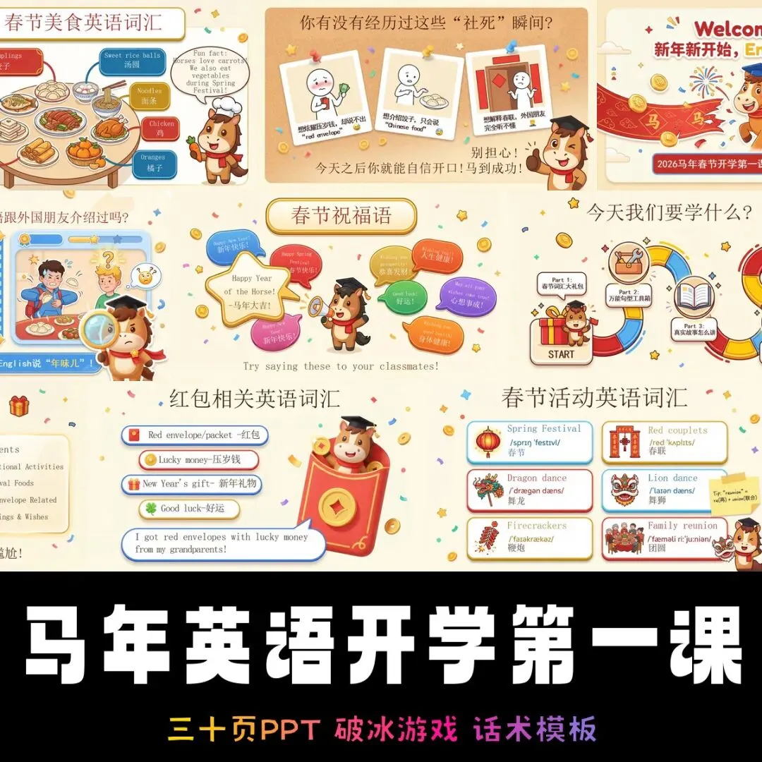 赠品丰富,含马年国风壁纸和元宵节猜灯谜游戏。附赠课堂破冰游戏库和话术模板Excel表格,以及马年开学第一课教学文档Word和PDF版本,拿来就能用。