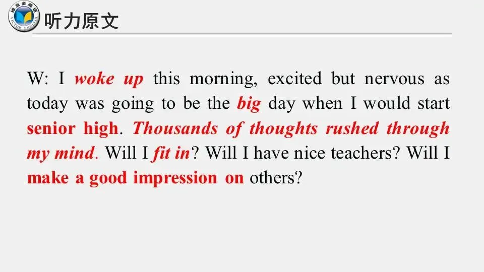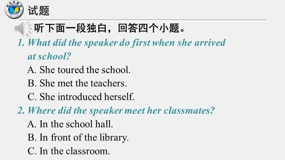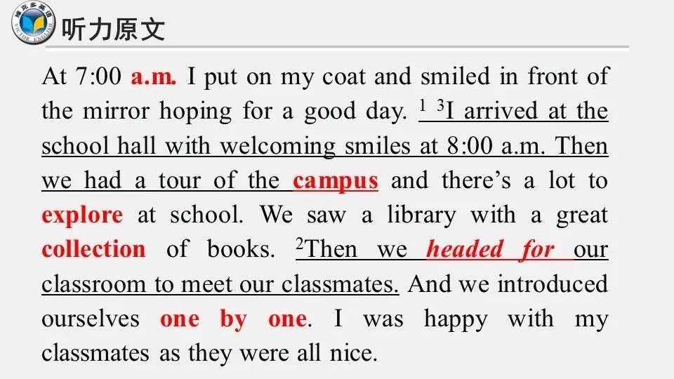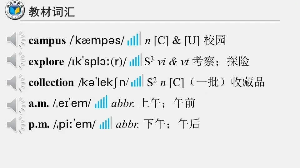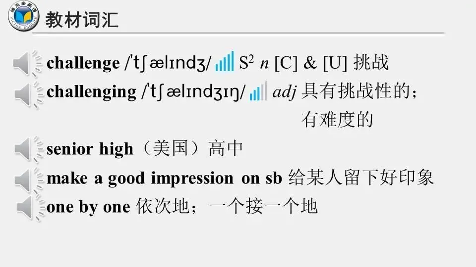 众所周知,在小孩学习母语的过程中,听是第一位的。“听”作为日常生活中运用最多的输入和交流方式,其作用不可忽视,所以要学好英语这门语言,听必不可少。而在听的过程中,词汇的作用不言而喻,因此把词汇和听力相结合并对词汇加以强化练习,是既能提高听力水平,又能学习词汇的非常高效的方式。所以建议学生在平时的听力练习中,选择与教材同步并复现教材词汇的听力材料,这样既能练习听力,又能通过听的方式巩固教材词汇。下面以人教、外研新教材的“学校生活”话题为例,看看以听的方式怎样学习词汇。我们可以通过以下步骤进行学习:词汇预习:通过听前词汇学习,帮助学生扫除听力中的词汇障碍;听听力试题:听含有教材词汇的听力材料,通过听的方式巩固教材词汇;听后反馈:精深学习听力文本,听读、听写相结合,突破听力障碍,培养学生的语用能力;听后跟读:跟读听力文本,模仿标准的英语发音,提高听辨能力和口语表达能力,在跟读过程中再次巩固教材词汇。